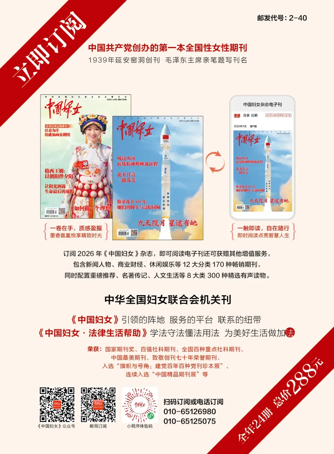 1、邮局订阅。全国各地邮局均可订阅,邮发代号 2-40,全年12期24册,总价288元。3、微信订阅。微信“我”→“服务”→“城市服务”→“办事大厅”→“便民服务”→“中国邮政报刊订阅”→“订阅首页”中国邮政-微商城,搜索“中国妇女”即可订阅。4、电话邮件订阅。与中国妇女杂志社出版发行部联系订阅。