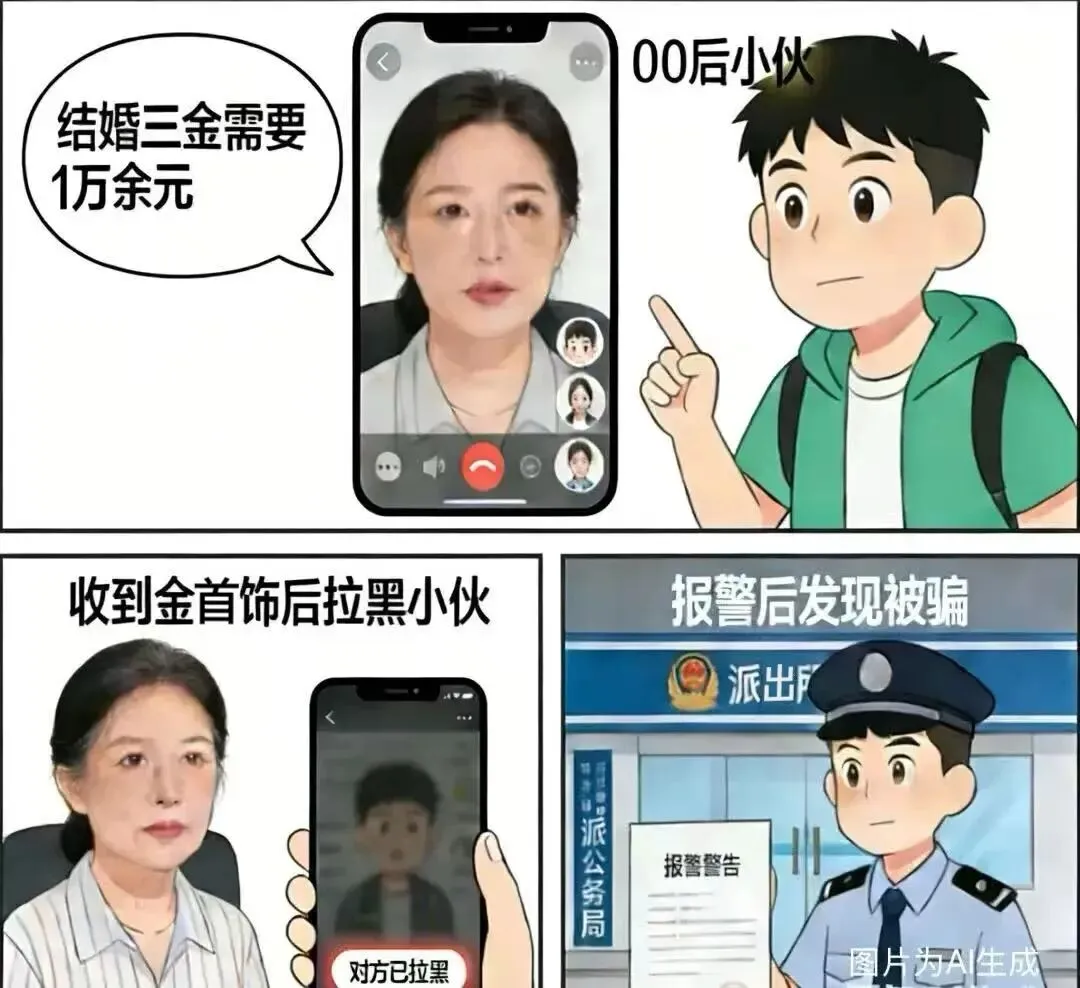 40多岁的嫌疑人白某某,已婚且有子女,却对自身经历全面“包装”。她隐瞒已婚事实,谎称29岁,通过短视频平台结识00后小伙并开展网恋。借助视频美颜,白某某塑造出“年轻貌美”的形象,让小伙深信不疑。感情升温后,她以“结婚需按习俗准备三金”为由,向小伙索要金首饰,让小伙花费1万余元。直到二人发生口角,白某某拉黑断联,小伙报警后才知这场感情是精心策划的骗局。