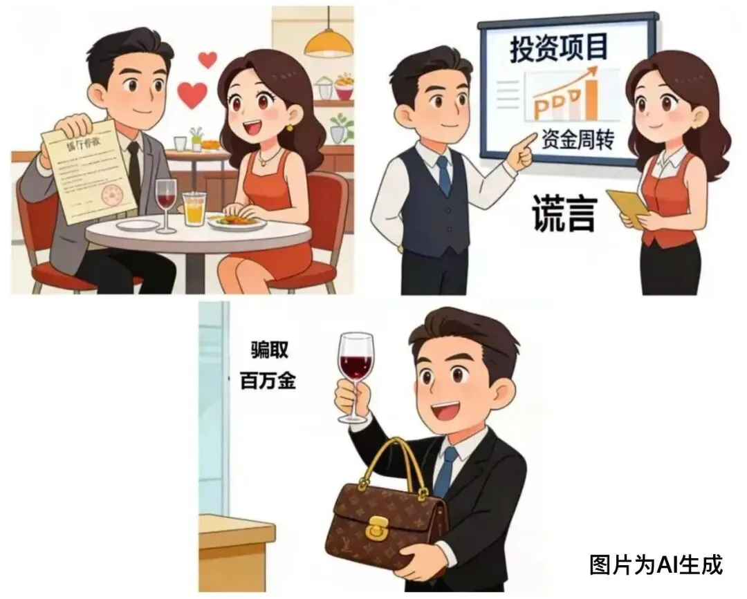 前两个案例的嫌疑人利用网络虚拟性行骗,而现实中的恋爱也并非绝对安全。嫌疑人陈某某伪造房产产权证明、银行存款凭证,将自己包装成事业有成、家境优渥的优质男性,先后与3名女性建立恋爱关系。感情稳定后,他编造“共同投资汽车贸易项目利润丰厚”“个人资金周转困难需短期借款”等谎言,向三名女友索要投资款或借款。凭借伪造证明和甜蜜承诺,陈某某骗取三人共计100余万元,这些钱款却并未用于“投资”或“周转”,而是被他挥霍享乐。当女友们催要还款时,陈某某已无力偿还。