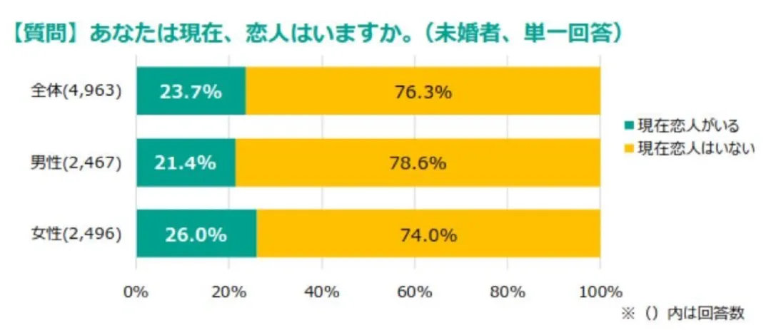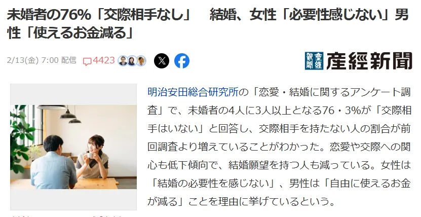 最新调查:日本未婚者中76%都没有恋爱对象,女性说“不需要男人”,男性则表示“自己挣钱只想给自己花”...