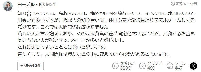 贫困的人正在增加,而当贫富差距被不断固化之后,既没有活动资金、也没有心理余裕的人,更容易陷入孤立。我感觉,这样的情况正在变得越来越常见。