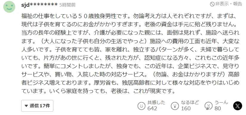 我是从事福祉工作的50岁单身男性。当然,每个人的想法都不一样,但首先必须承认的是,在当今社会,抚养孩子的成本实在太高了。等到老了,手里往往几乎存不下什么养老钱。