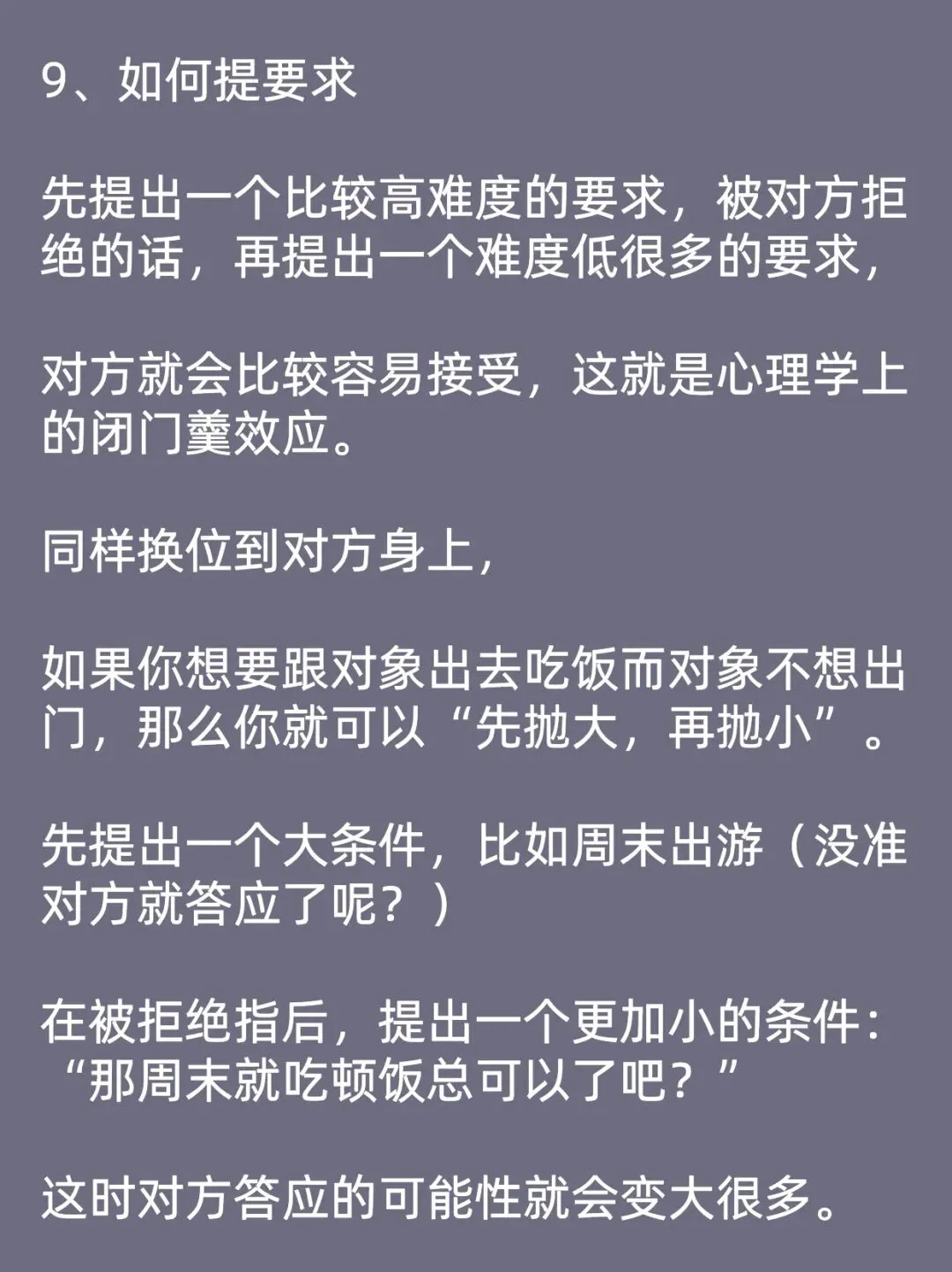 先提出一个比较高难度的要求,被对方拒绝的话,再提出一个难度低很多的要求,对方就会比较容易接受,这就是心理学上的闭门羹效应。