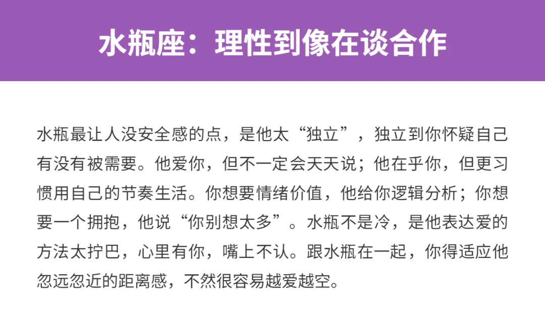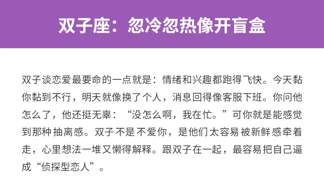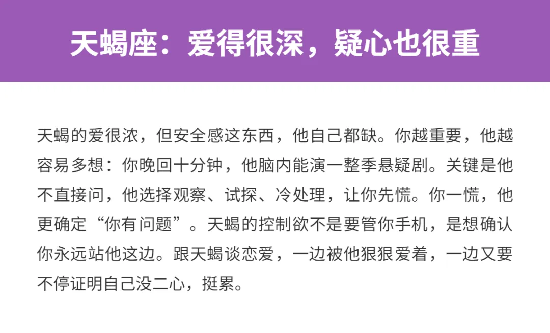 谈恋爱最怕啥?不是没钱,也不是异地,而是你明明在关系里,却总像在猜谜:ta到底爱不爱我?是不是又在冷我?我是不是哪里做错了?有些星座吧,真不是坏,也不是不专一,就是他们的表达方式太“反安全感”了:一会儿热一会儿冷,嘴上不说心里戏多,甚至自己都搞不清自己要什么。跟他们谈恋爱,你得自带充电宝,随时给自己补能量。下面这三位,堪称“安全感黑洞”选手。