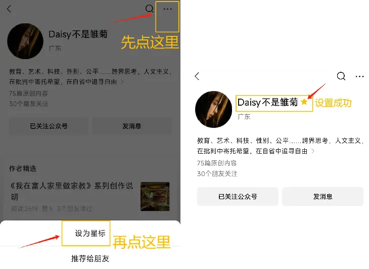 要想第一时间收到新文章消息,可以把公众号设置为星标,具体步骤如下图:(先点到个人主页)
