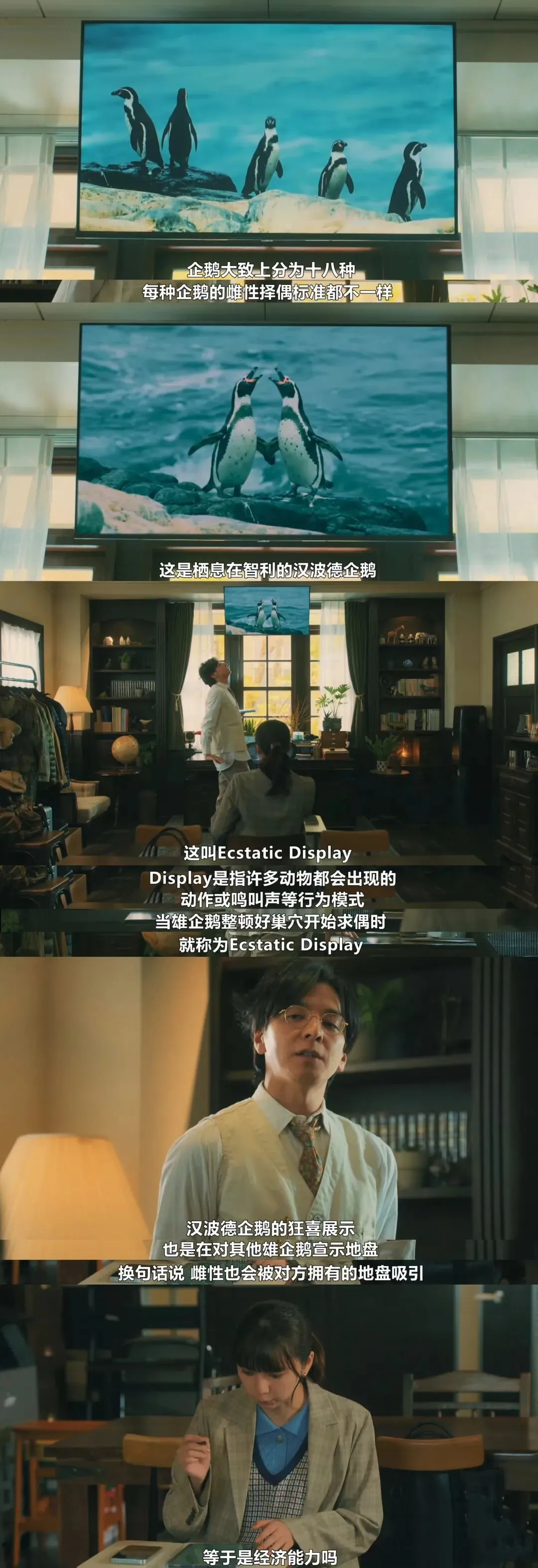 第一集中,就以汉波德企鹅(择偶看领地=人类经济实力)、小蓝企鹅(偏好低沉叫声=健康体征)、阿德利企鹅(献石求爱=浪漫仪式),引发对"人类择偶标准过于复杂”的反思。