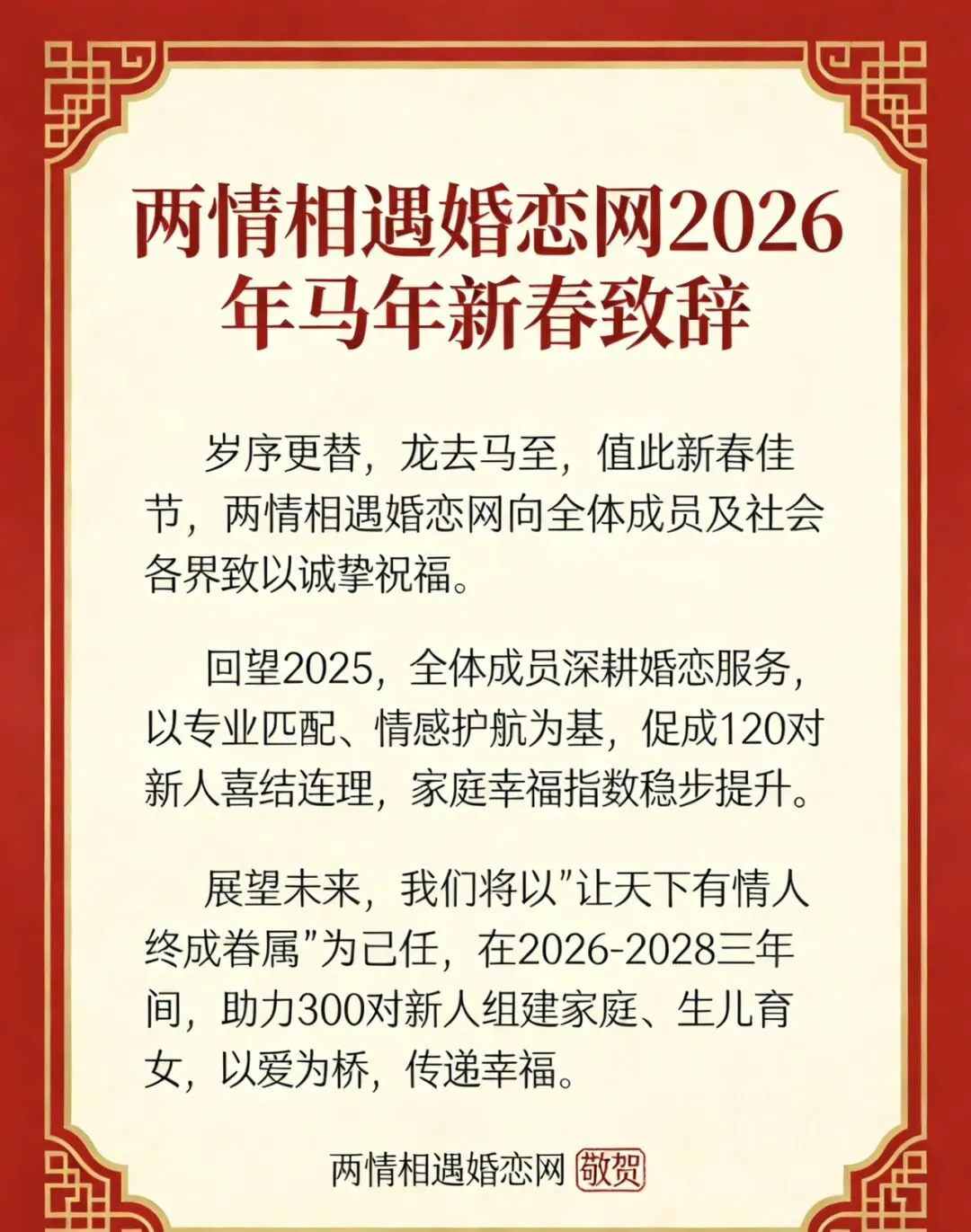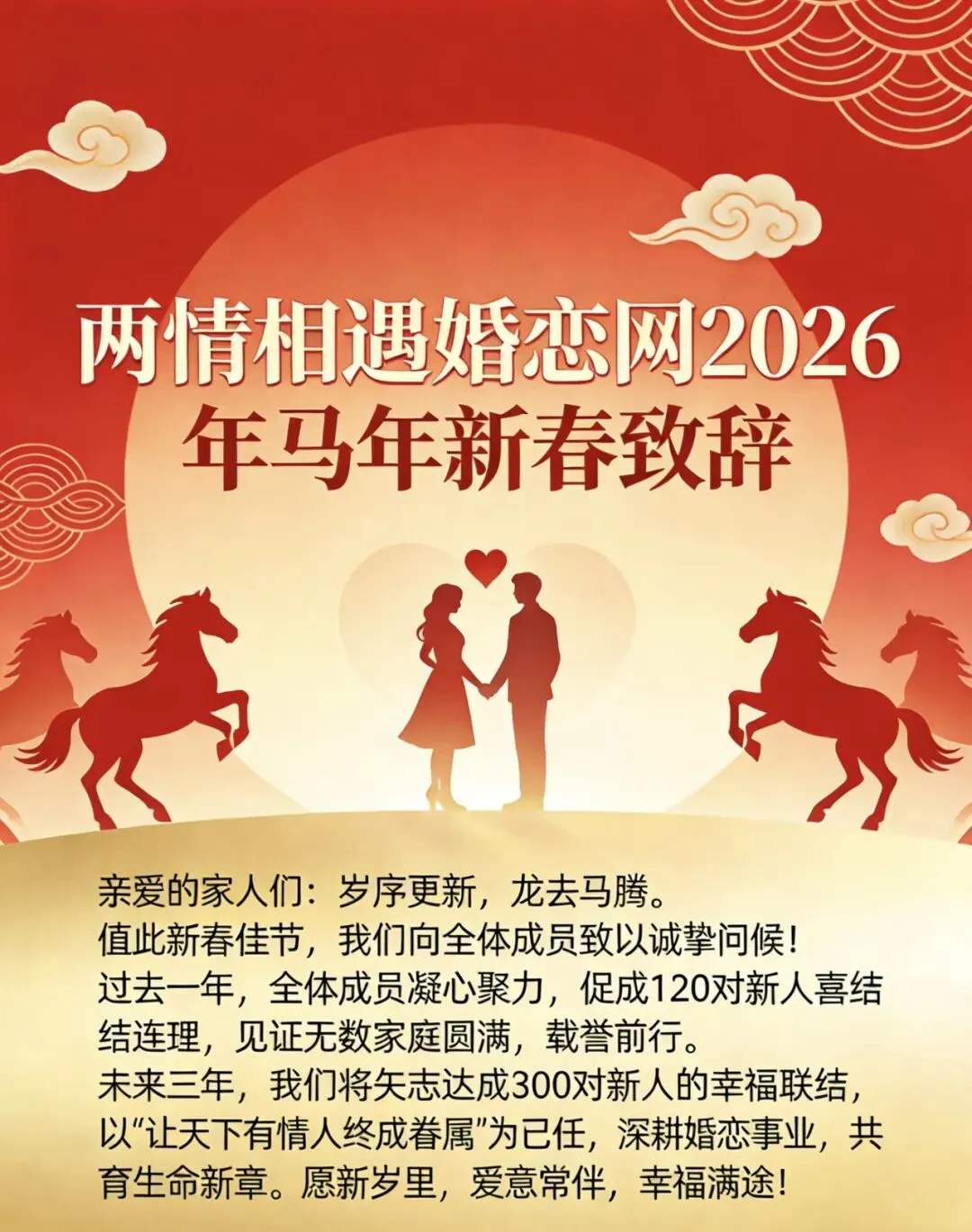 岁序常易,华章日新。当丙午马年的春风拂过人间,我们迎来了充满生机与希望的新春佳节。值此辞旧迎新、共襄盛举之际,我谨代表两情相遇婚恋网,向长期以来携手同行的全体家人,致以最诚挚的问候与最崇高的敬意!向所有信任我们的单身朋友,以及默默支持平台发展的各界贤达,致以最美好的新春祝福!