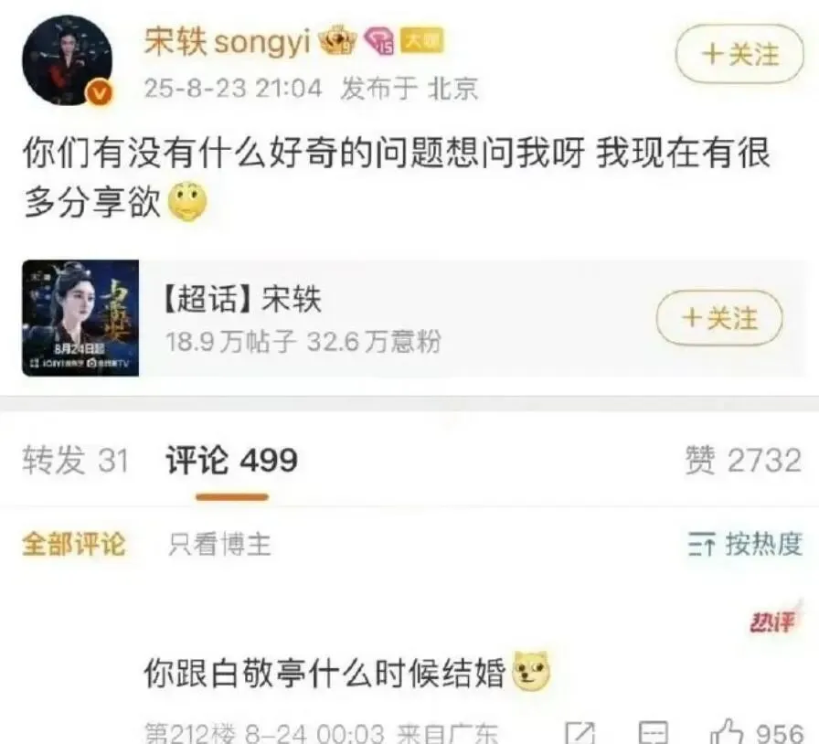 去年8月,宋轶发了个帖子,问粉丝有什么想知道的。热评第一就是:“你什么时候和白敬亭结婚?”