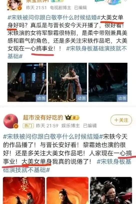 紧接着,网上就开始出现各种“宋轶美女独美”、“专注事业”的营销内容。那时候大家都觉得是正常宣传,现在想想,每一个细节都在暗示着什么。