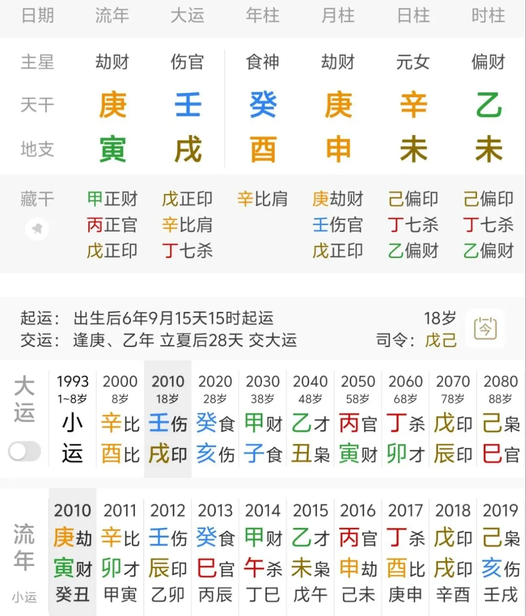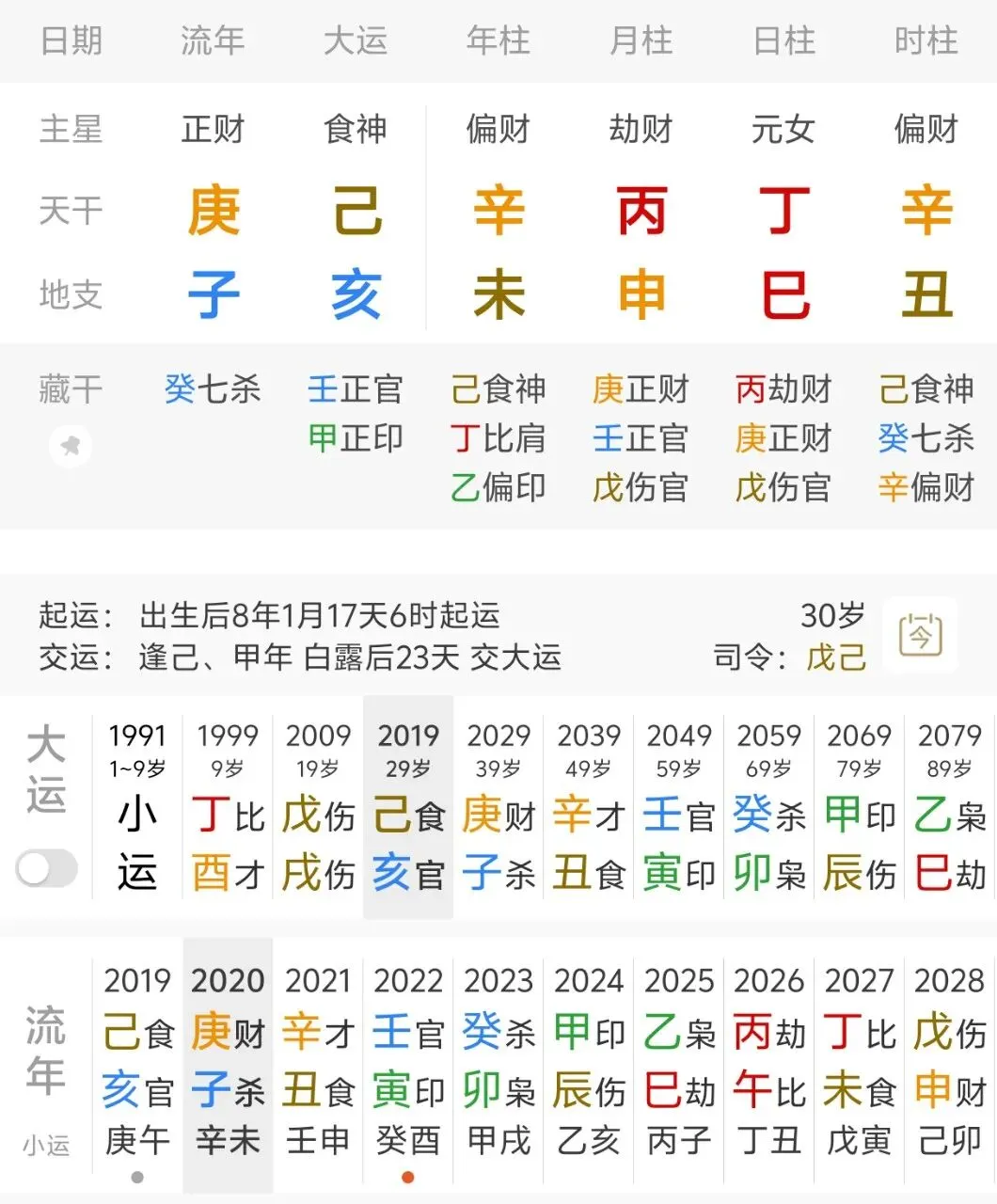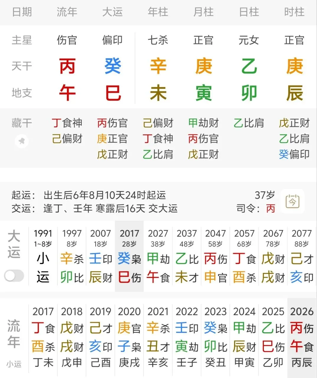 2.应期多庚辛都在,年月时皆有夫星,中年晚年也不会感情平顺。