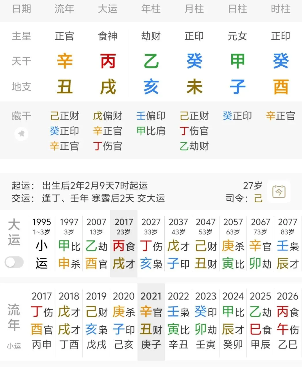 2021年(辛丑)老公出轨,正官透出与大运食神作合,此年还有亥子丑