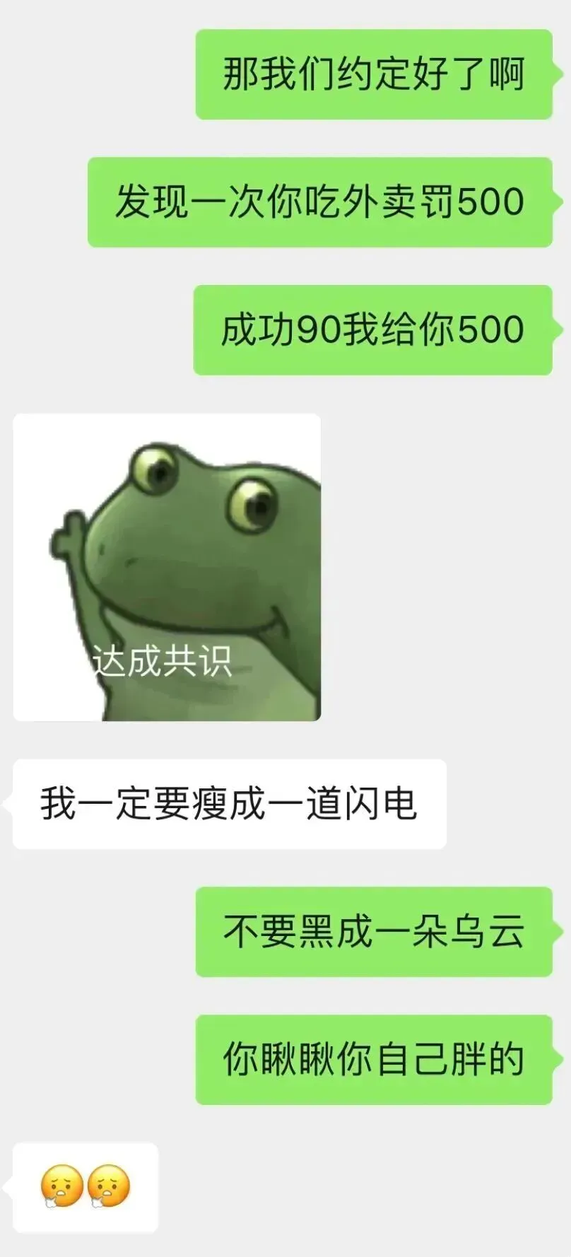 然后我们前几天就约定了,只要她吃一次外卖就给我500块钱算作罚款。如果她一顿没吃,2个月之内瘦到90我就给她500。还算是公平公正合情合理吧?