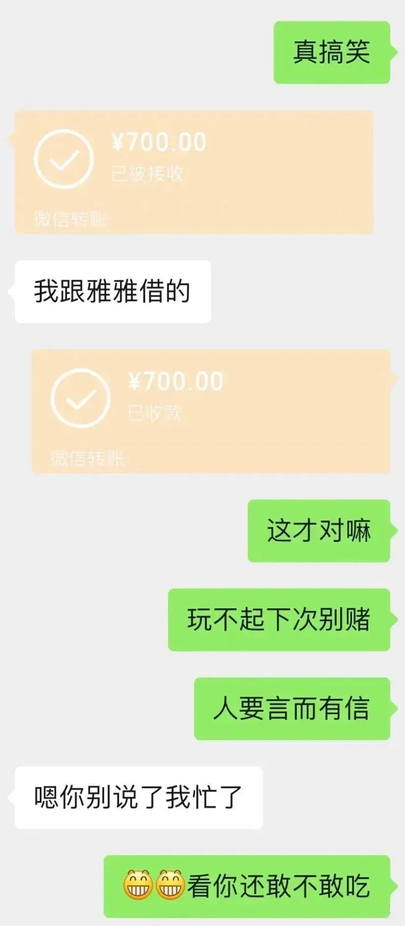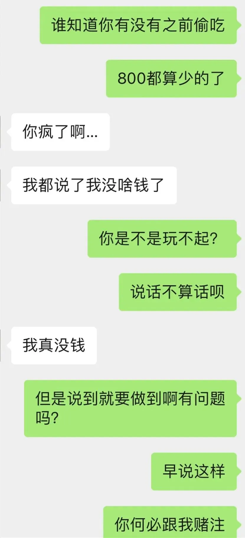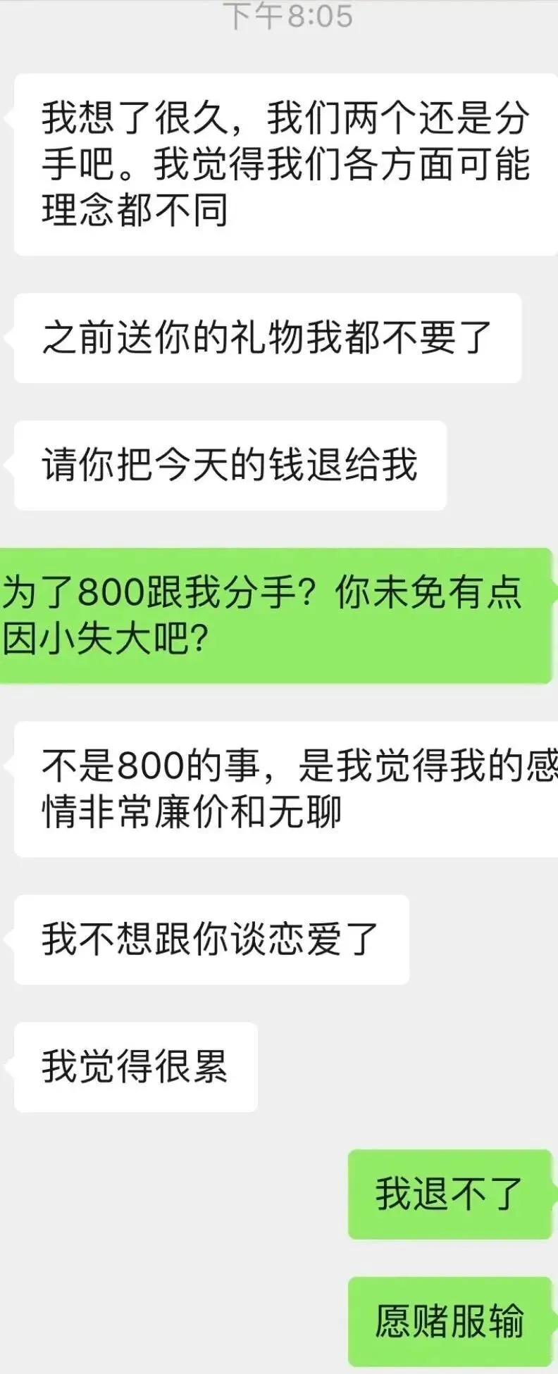 本来我以为她只是生闷气,结果8点左右她给我发消息要和我分手,让我把800块钱还给她。我当时都气乐了,首先因为区区800就要分手。其次分手了还一定要要回赌注800元,我觉得很没有意思。我就拒绝了。