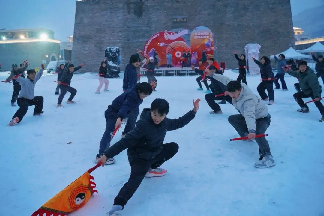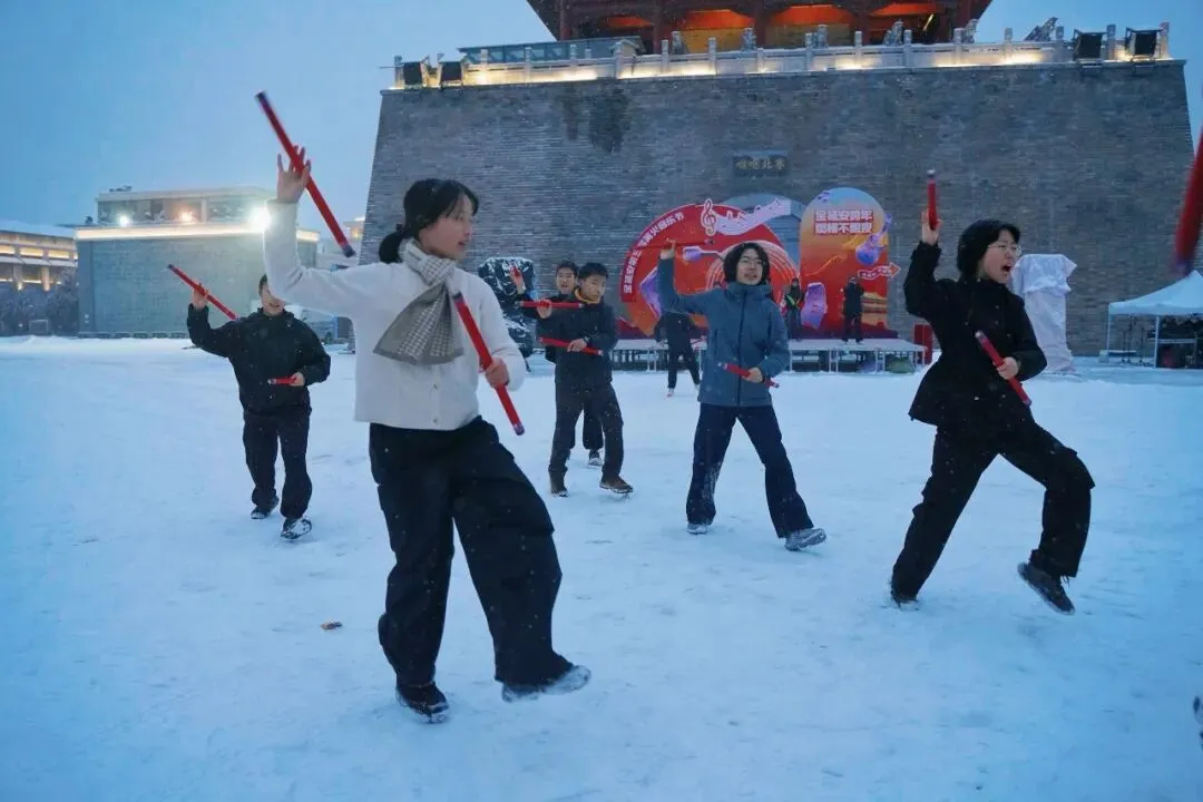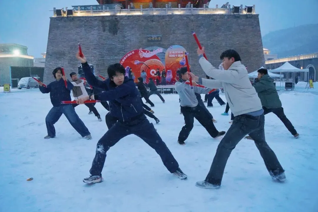 晚上的雅集宴会,英歌在外面开场,雪里打英歌应该是第一次。我看着他们打,感觉到身体里一股气被提了起来。寒冬的雪再大,也有暖意,英歌在雪中更加有气势。室外结束后转到了室内,热闹的活动伴随着窗外的雪,我突然感慨:这虽不是什么大型国际宴会,但情味却比大型还要浓。各种各样展演,边吃着饭边看着台上。每当有联欢晚宴时,我都特别开心,没有血缘关系的人聚在一起,才是真正的亲。我是何其有幸在13 岁少年初期就进到了夸父班啊!