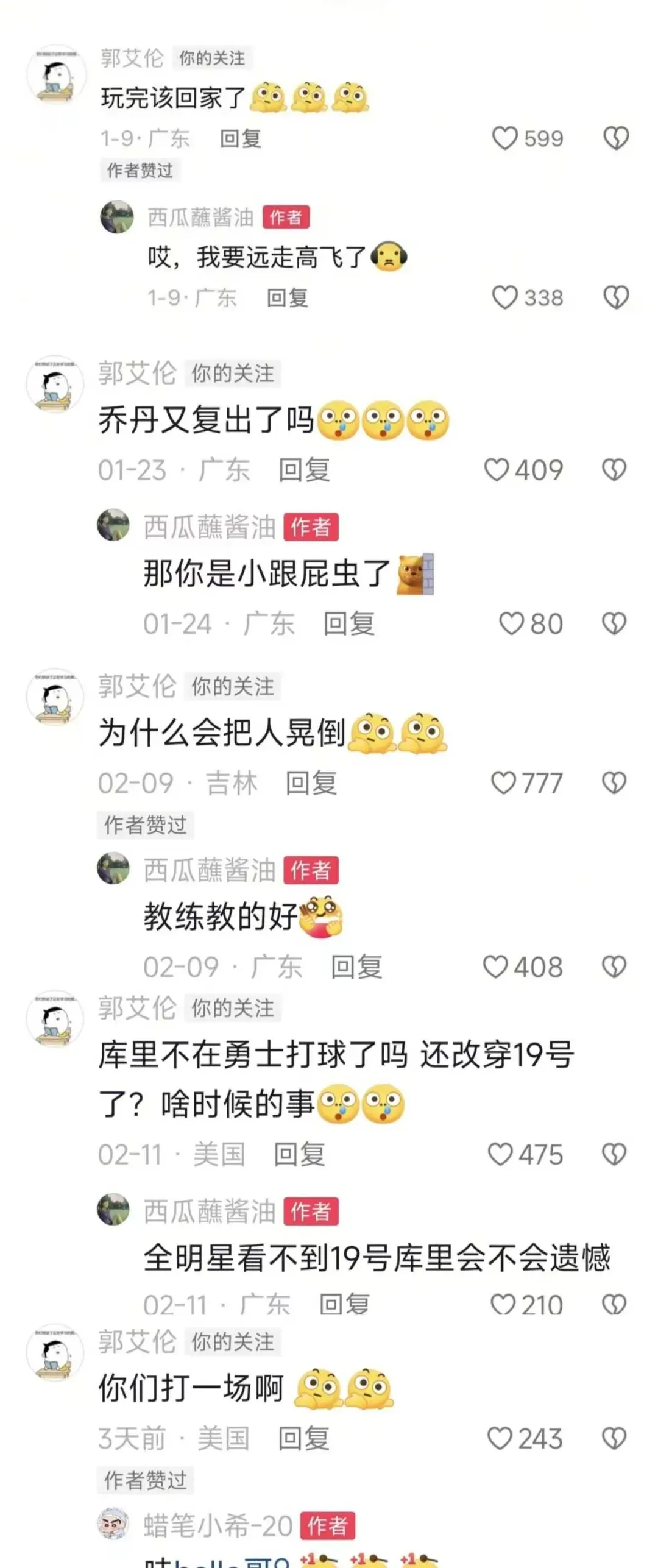 就连近期郭艾伦受邀远赴美国,参加NBA全明星活动,人在异国他乡,也没忘了关注这位女博主。他特意跑到对方评论区留言,幽默调侃:“库里改穿19号了,啥时候的事?”“你们打一场啊”,这份关注度,很难不让人多想。