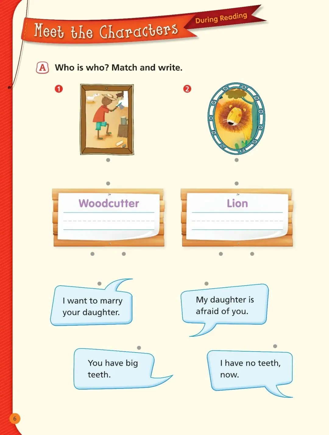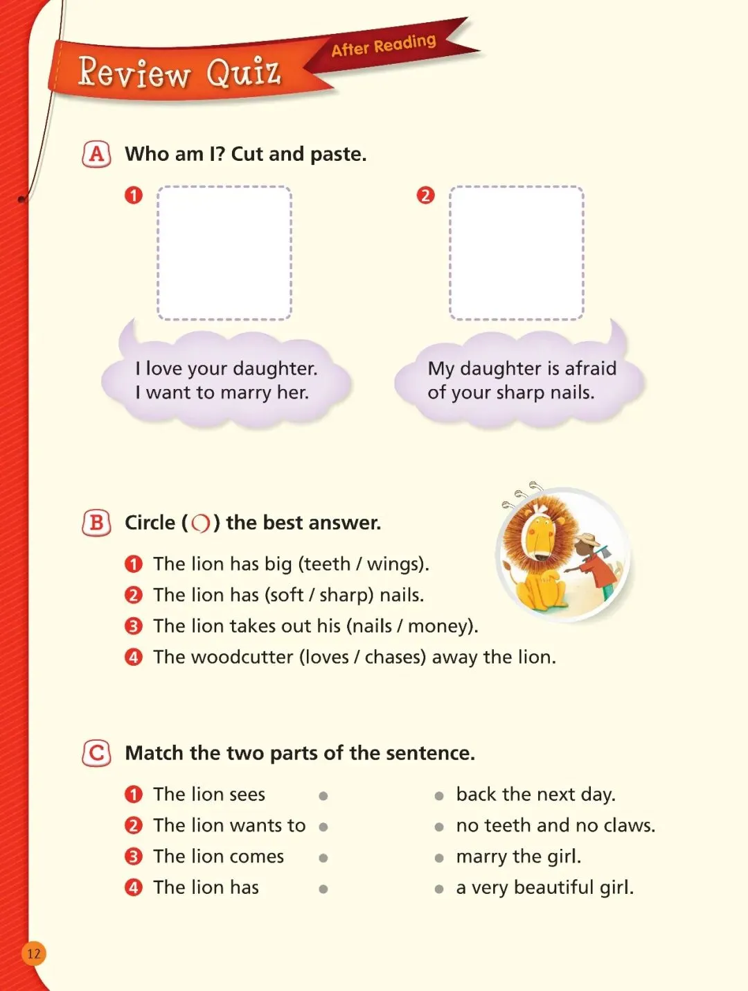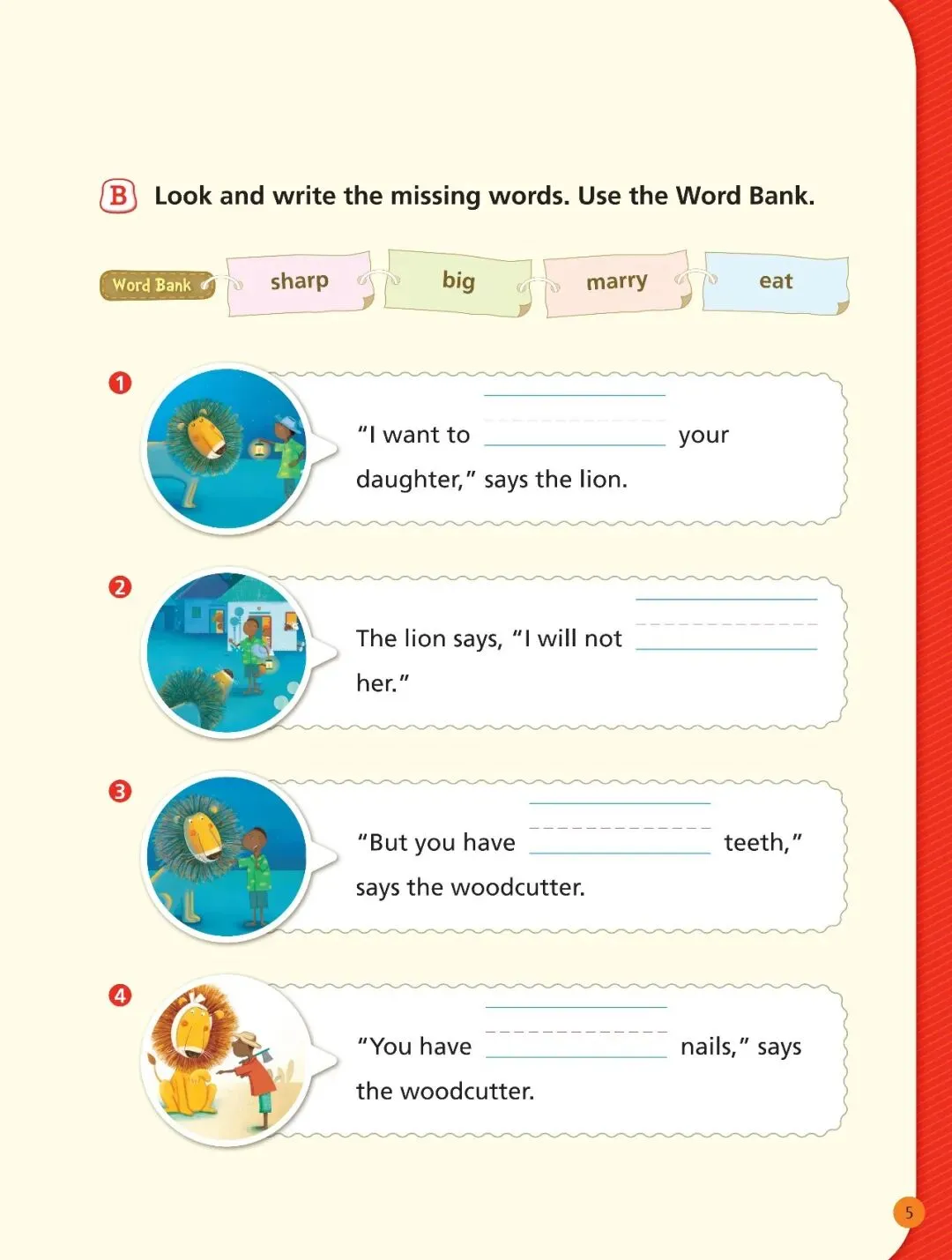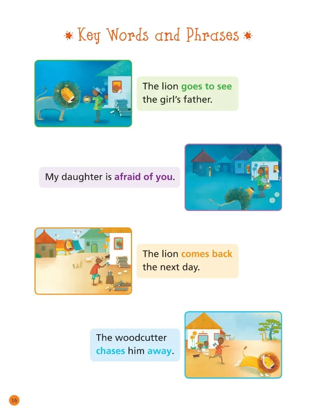 lion(狮子)、girl(女孩)、father(爸爸)、woodcutter(樵夫)、daughter(女儿)