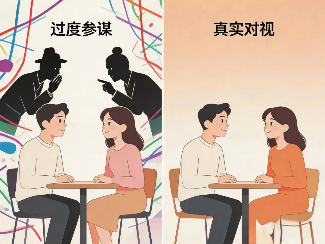 这个春节,一个热梗在年轻人中间炸开了锅——“俩人谈恋爱四个人烧脑”。是什么意思?现在年轻人恋爱,表面看是两个人的事,实际上变成了四个人的脑力博弈:你带一个军师(闺蜜/兄弟),她带一个军师,2v2情感对战模式正式开始。军师们需要做些什么?分析聊天记录、制定约会计划、挖掘隐含的意思、代为回复信息。你发出去的每一句话,背后都有两个人在反复推敲;她回给你的每一个表情,都有三人会议集体表决的结果。网友们一边自嘲一边狂欢:“军师从不上战场,但是理论经验满分”“正主没成,军师在一起了”“四边形有稳定性,爱两个人要藏好”。从什么时候开始,我们连喜欢一个人都不敢自己做决定?因为害怕输掉。怕说错一句话,形象就全毁了;怕意思传错了,满盘皆输;怕自己太积极,显得不专业;怕自己太消极,错过机会。恋爱变成了一种精密的风险投资,每一步都要反复论证、多方求证。当事人拿不定主意,军师们各执一词,最后变成了“悬疑大片”,小事被反复推理(迟归几分钟、眼神飘忽一下),脑补出一整部剧的剧情。正是因为太在意,所以才不敢出错;正是因为太想赢,所以才不敢独自上场。借助外脑不过是给一颗忐忑的心找到一个安全气囊。但是问题在于,随着军师越来越多,我们自己的声音还能被听见吗?你有没有发现这样一个现象,那就是被军师反复推敲、精心策划过的对话,发出去之后,常常会显得生硬,做作,不像自己说的那样自然。为什么?因为那不是你自己的声音,而是多人会议拼凑出来的“标准答案”。你对她好,并不是因为军师说“这时候应该示好”,而是因为你真心想对她好;你约她去某个地方,也不是因为军师说“这个地方适合约会”,而是因为你真的喜欢那里。把决策权交给别人的时候,你交出去的不仅仅是那条信息,还有你自己在关系中所处的位置。更可怕的是,过分信任军师,会让人慢慢失去对感情的判断能力。哪天军师不在的时候,你都不敢发一条“在干嘛”的消息;哪天军师的意见不一致的时候,你就会陷入更深的迷茫。把你的感情控制权交出去了——这是你想要的吗?她帮着你分析得很清楚,但是最后要面对那个人、承受那份情绪、经历那些患得患失的夜晚的人还是你自己.她可以拍手说“我早说过”,但是人生不能重来。这不是怪军师。军师们也是出于好意,她们真心希望你能赢。但是你要知道,就算军师再懂兵法,也无法代替你亲自上阵杀敌。恋爱终究是两个人的事情。当把第三人、第四人拉进场的时候,你们之间的互动就掺入了杂质。原本应该由你们共同创造的默契,试探、拉扯、靠近变成了多方博弈的结果。你得到了安全感,但是失去了真实感。如果现在你处于“多人脑力博弈”的模式下,我建议你:即使犯错,即使难堪,即使失败。但是那句话是你自己说的,邀请也是你自己发出去的,心动也是你自己体验到的。你与她之间没有第三者。有网友说:“恋爱终究是两个人的事情,揣测和军师让多余的那个人退场,才能面对真实的自己。”我认为这是正确的。真实的部分,比如紧张时的手心出汗、说错话的尴尬、不知道说什么的沉默,并不是减分项,反而是你在意的证明。完美的表演不能打动人心,而真实的笨拙却可以。今年春节还有一个热梗叫“爱你老己”。年轻人开始把目光从外界收回,关注自己内心的感受,为自己购买“情绪年货”,亲手搓出年的味道,在快节奏的生活里慢下来。向外求索——借助外脑以规避风险;向内安顿——关注自我、取悦自己。表面看方向相反,实际上指向同一个命题:我的答案是:先爱自己,再爱人。先把自身的感受安顿好之后再去面对另一个人;先相信自己值得被爱,然后再表达出对别人的喜欢。当不再害怕失败,不再需要军师壮胆,不再把恋爱当成考试的时候,你才能真正地享受其中。在输入框中删除了再输入、输入了又删除的人就是你自己。这些时刻,军师帮不了你,也不能代替你。它们属于你,只属于你。所以,试着把军师请出来吧。让他们在观众席上为你加油,但是不要让他们上场替你踢球。