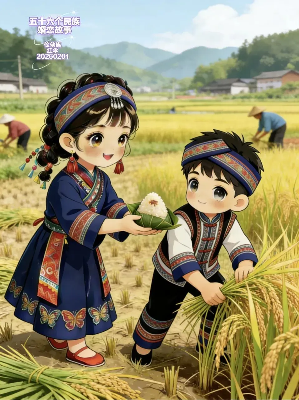 在这片金色的海洋里,爱情的萌芽往往始于一次不经意的对视。就像画中的姑娘,她穿着靛蓝色的百褶裙,裙摆上绣着五彩的蝴蝶,在阳光下翩跹如蝶。她的发辫上缀着彩色的珠串,随着动作轻轻晃动,一双大眼睛像山涧的清泉一样明亮。她捧着用宽大荷叶包裹的糯米饭,米饭上点缀着鲜红的相思豆,香气随着她的脚步在田埂上飘散。而不远处的男孩,穿着绣有稻纹的对襟短衫,正用力将一束沉甸甸的稻穗抱在怀里,他的目光越过金黄的稻秆,落在姑娘的身上,眼神里满是温柔。