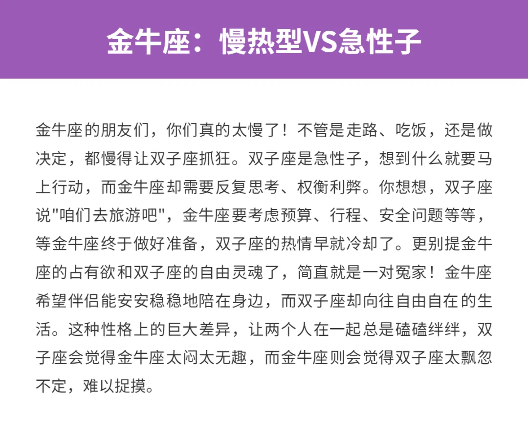 双子座的小伙伴们,你们是不是经常被人说"三分钟热度"、"喜新厌旧"啊?别急着否认,咱们双子座确实喜欢新鲜感,对于感情也是如此。虽说爱情没有绝对的配不配,可有些星座和咱们双子座谈恋爱,简直就是在互相折磨!今天就和大家聊聊,双子座最不适合和哪些星座谈恋爱,看看你是不是正在和这些星座交往呢?如果是的话,可要多长个心眼咯!毕竟感情这事儿,合不来真的会很累很累。