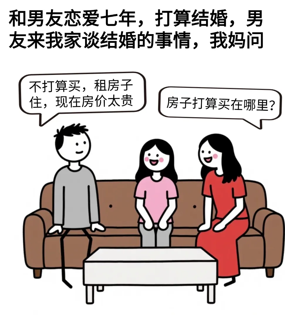 >开心漫画:和男友恋爱七年,他来家里谈结婚,我妈:房买哪里?男友:租房.我妈:啥车?男:没车.彩礼呢?男:要彩礼就不是真爱,不能给