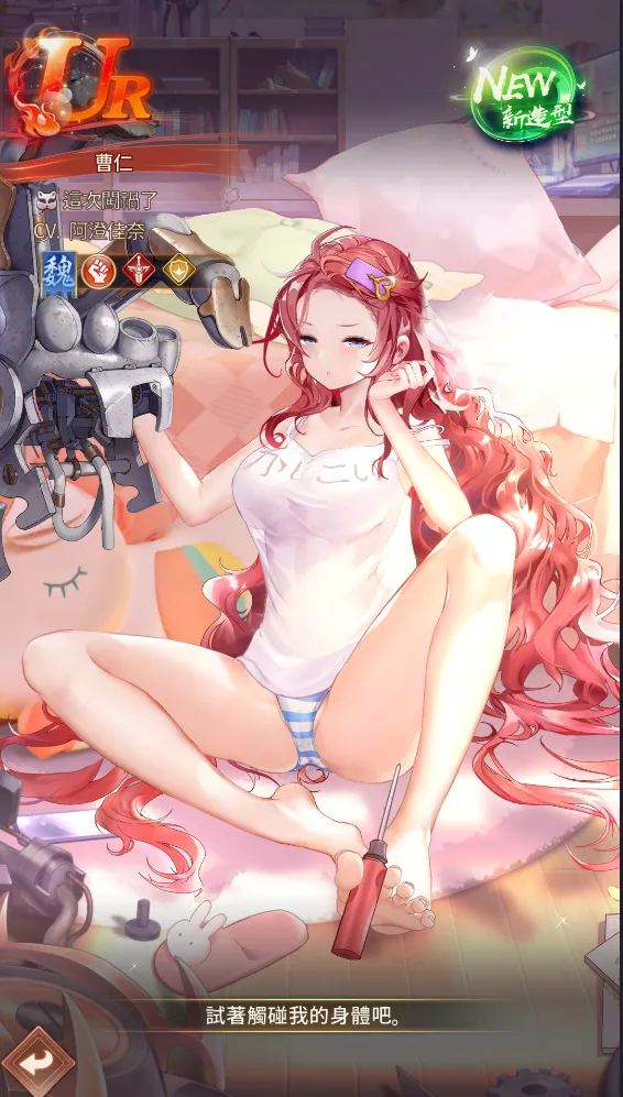 游戏不断更新,惊喜连连。截图中的“NEW”标识提示我们,武将曹仁以全新造型登场!那句“试着触碰我的身体吧”不再仅仅是挑衅,在少女回战的世界里,它变成了一声娇憨的邀请。快来游戏中收集你心仪的角色,组建属于你的最强美少女战队吧!-1-4-7