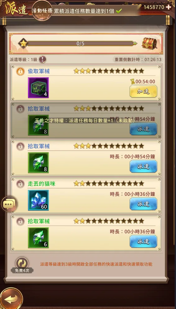 如果你是一个策略爱好者,游戏中的“派遣任务”系统绝对会让你着迷。从“偷取军械”到“走丢的猫咪”,各种任务等你调兵遣将。通过提升派遣等级,还能解锁快速派遣和快速领取功能,让你的资源获取效率事半功倍。而“命轮”系统则提供了深度的角色培养路径,通过升星获得命星,为心爱的武将提供巨额的属性加成。-1-4-7