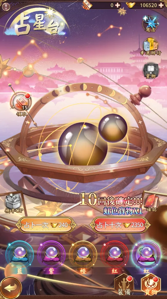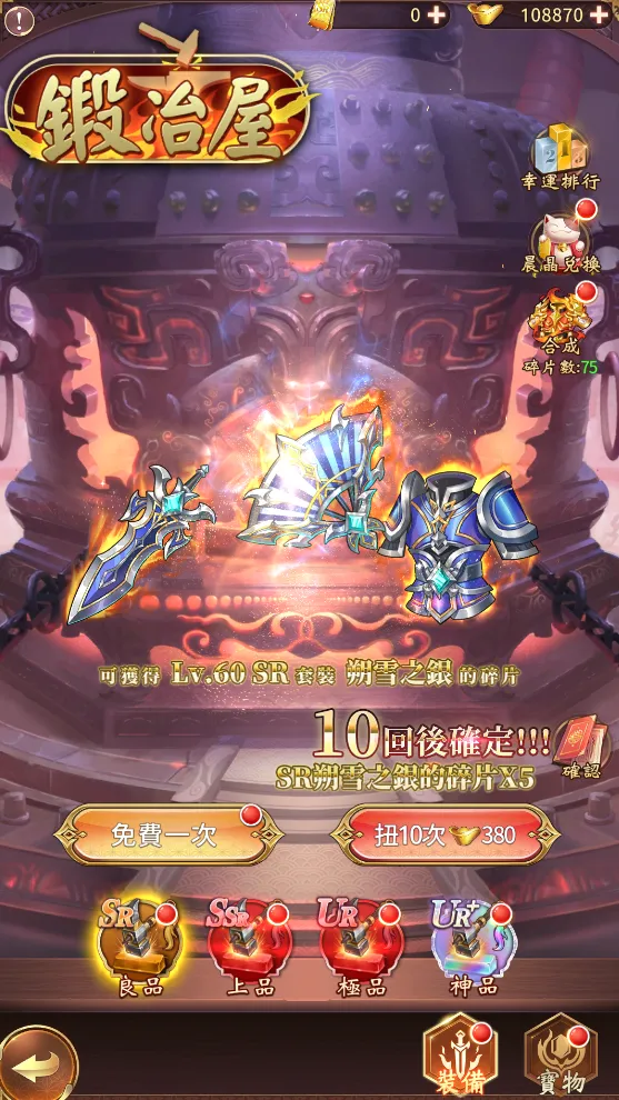 想要验证自己的欧气?可以去“占星台”占卜宝物,或是挑战“幸运排行”,看看自己是否能一发入魂,获得稀有道具。截图中的扭蛋机界面显示,消耗一定数量的货币即可进行扭蛋,无论是良品、上品还是极品、神品,都有机会纳入囊中。那种“10回后确定”的期待感,正是游戏乐趣所在。-1-4-7