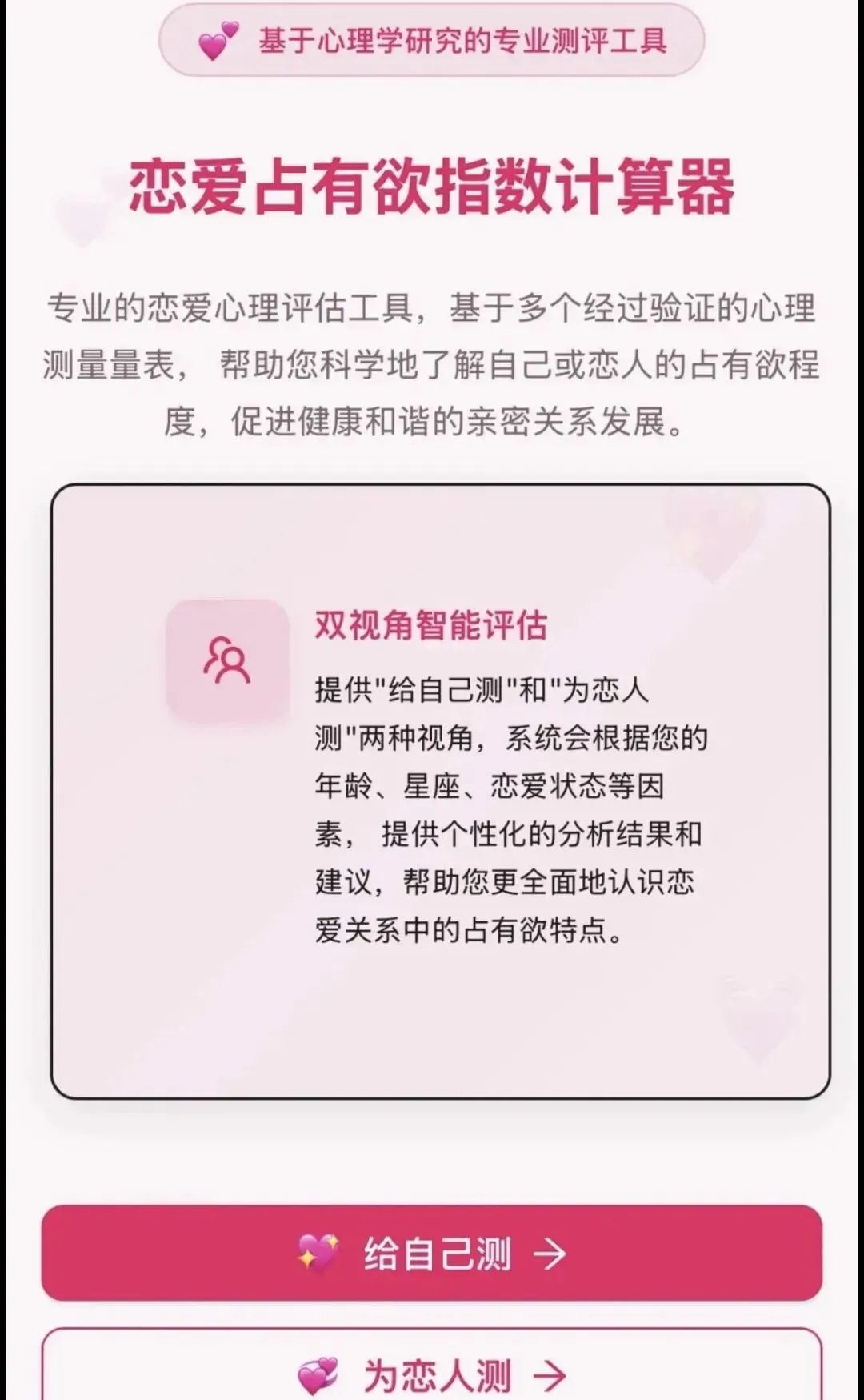恋爱中总忍不住查对方手机、看到 TA 和异性说话就吃醋?快来测测你的恋爱占有欲指数!这款免费的恋爱占有欲测试超火,不管是给自己测、给恋人测,还是情侣一起做,都能通过趣味答题看清自己的占有欲等级 —— 是低占有欲的 “自由派”,中等占有欲的 “甜蜜守卫”,还是高占有欲的 “醋坛子精”。测试基于专业心理学量表,匿名答题后会给出详细结果解析和个性化建议,不光能帮你摸清自己的爱情边界,还能找到缓解焦虑、平衡占有欲的小技巧。想知道自己的占有欲会不会变成感情的枷锁?