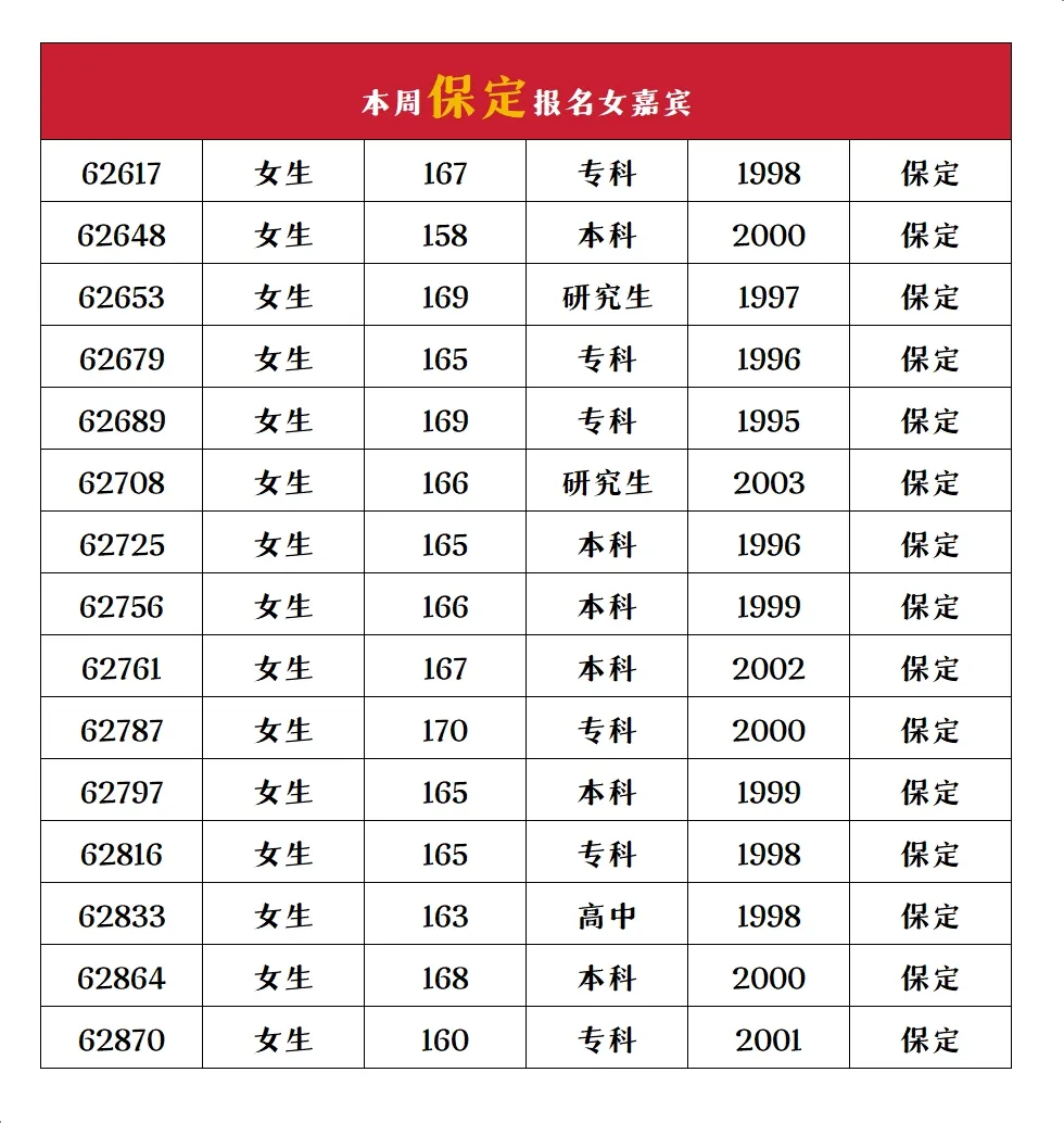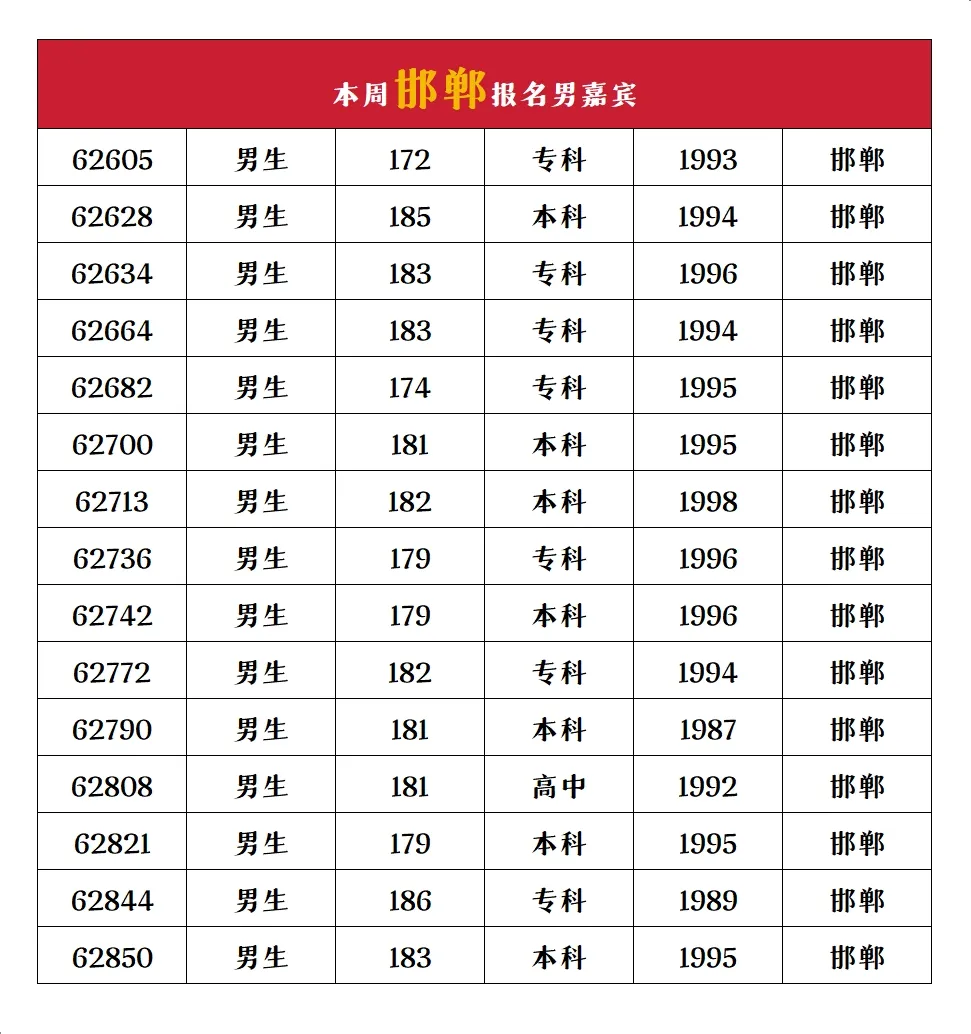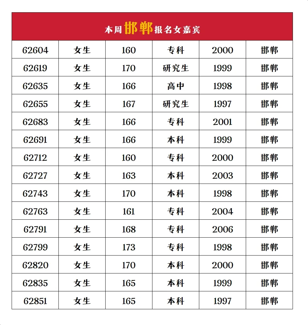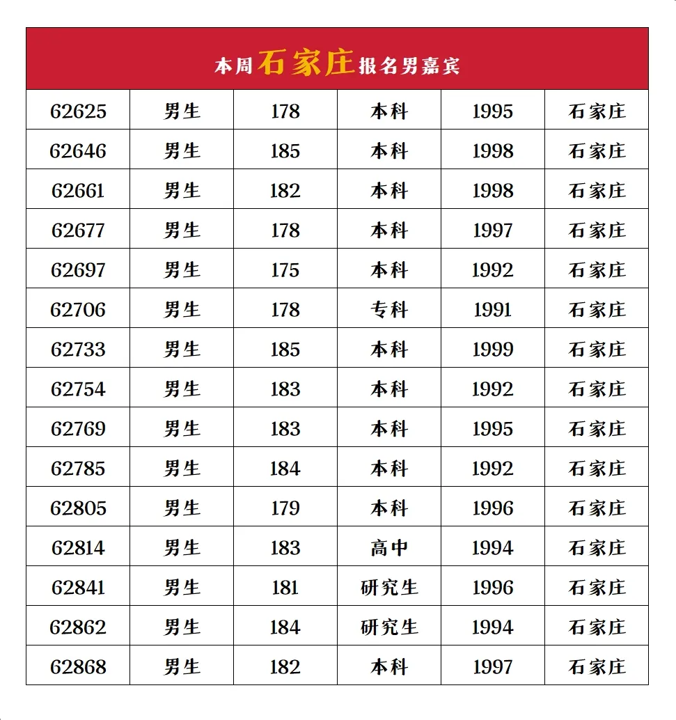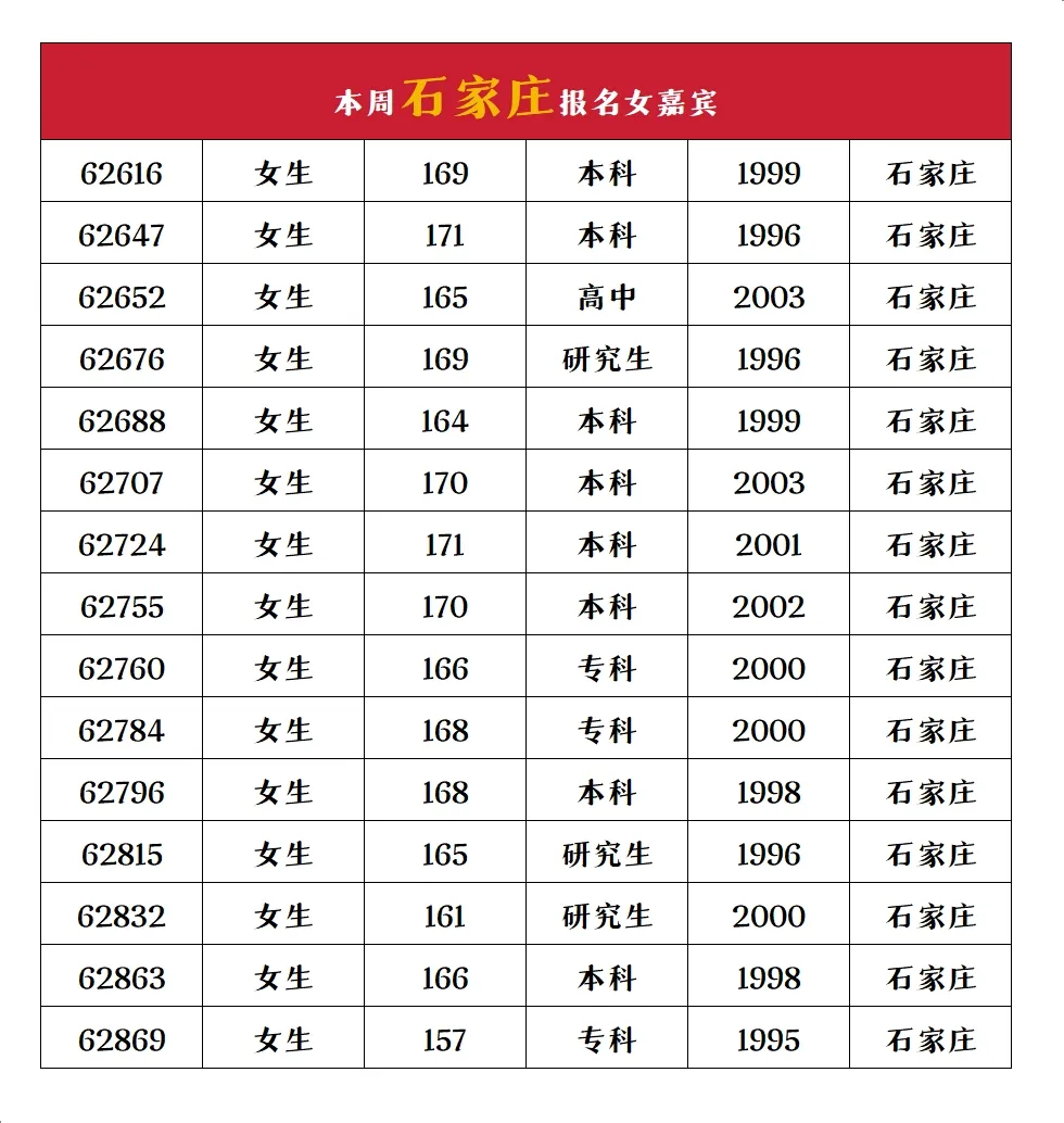 本期恋爱匹配已报名嘉宾,篇幅有限,每个城市仅展示部分嘉宾,目前河北开放城市:石家庄、保定、唐山、邯郸、沧州、邢台、廊坊、衡水、张家口。