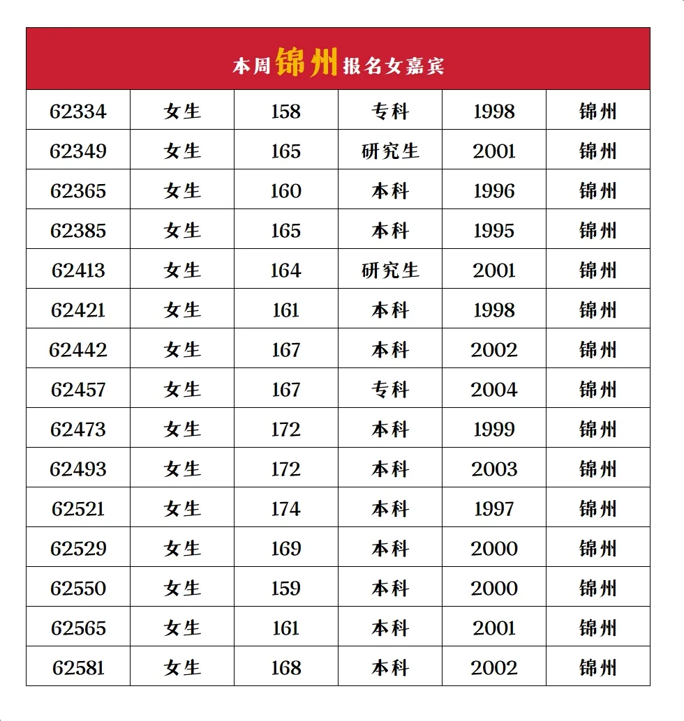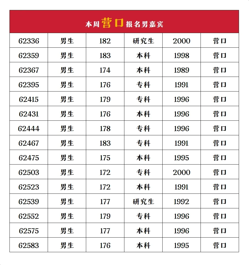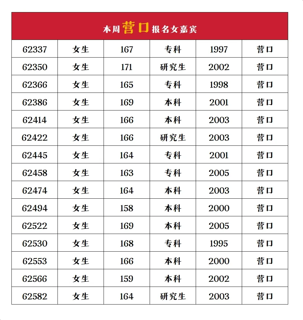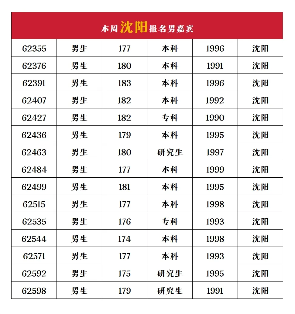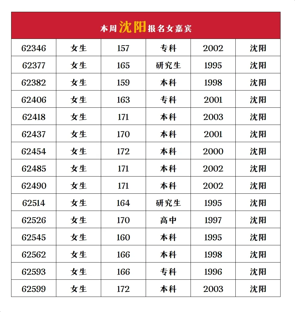 本期恋爱匹配已报名嘉宾,篇幅有限,每个城市仅展示部分嘉宾,目前辽宁开放城市:沈阳、大连、鞍山、盘锦、锦州、营口、朝阳、本溪、抚顺