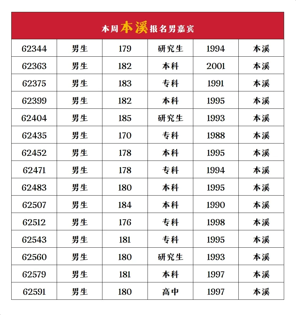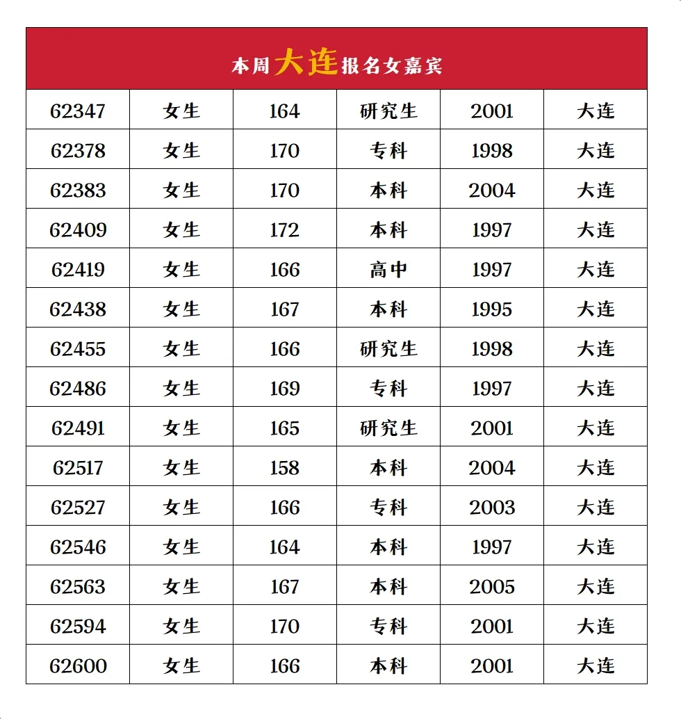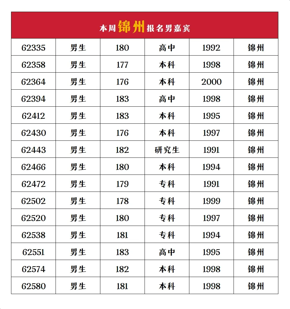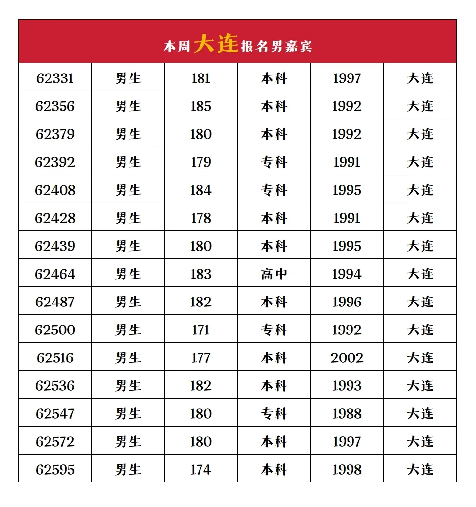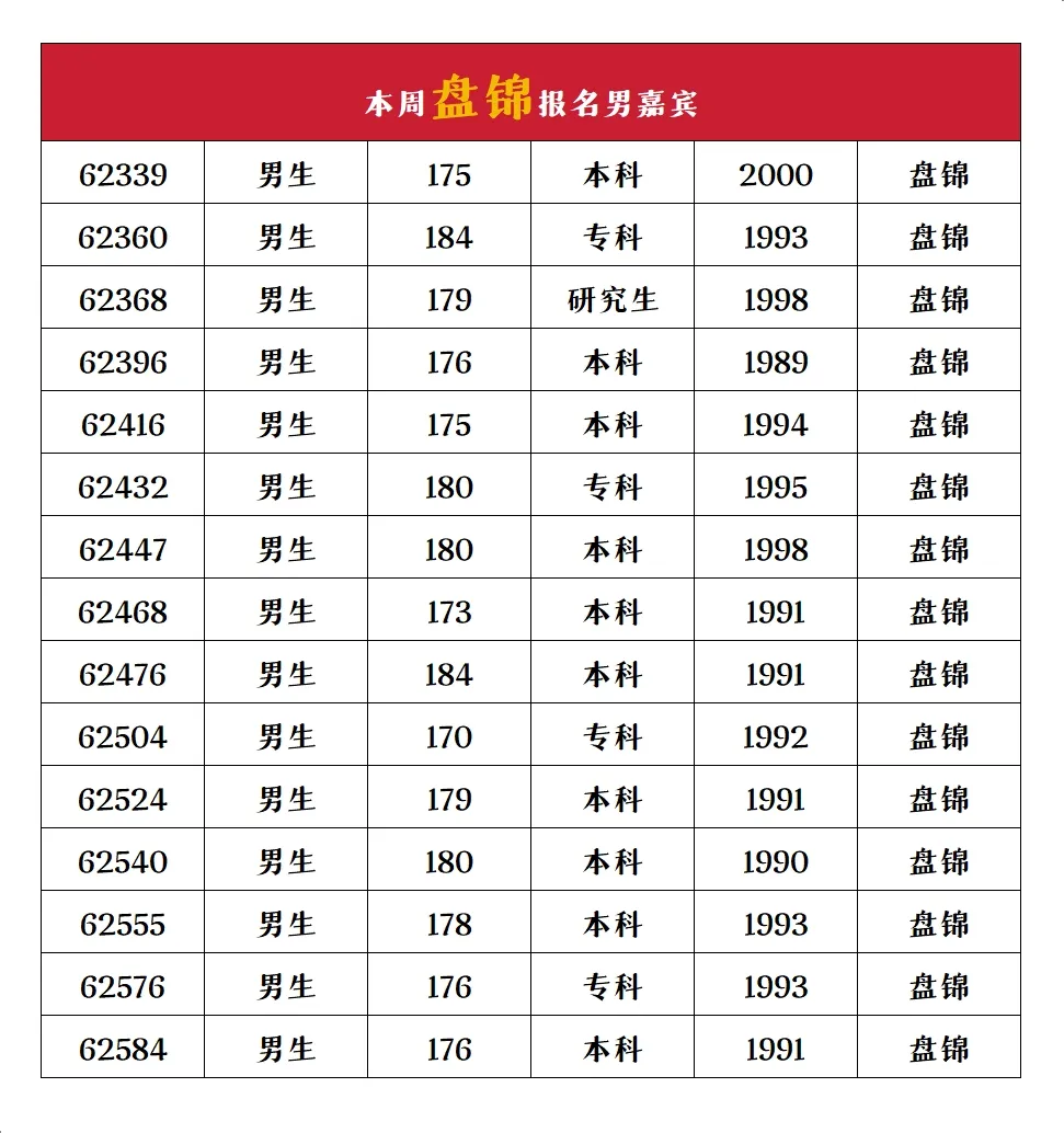 本期恋爱匹配已报名嘉宾,篇幅有限,每个城市仅展示部分嘉宾,目前辽宁开放城市:沈阳、大连、鞍山、盘锦、锦州、营口、朝阳、本溪、抚顺