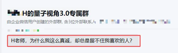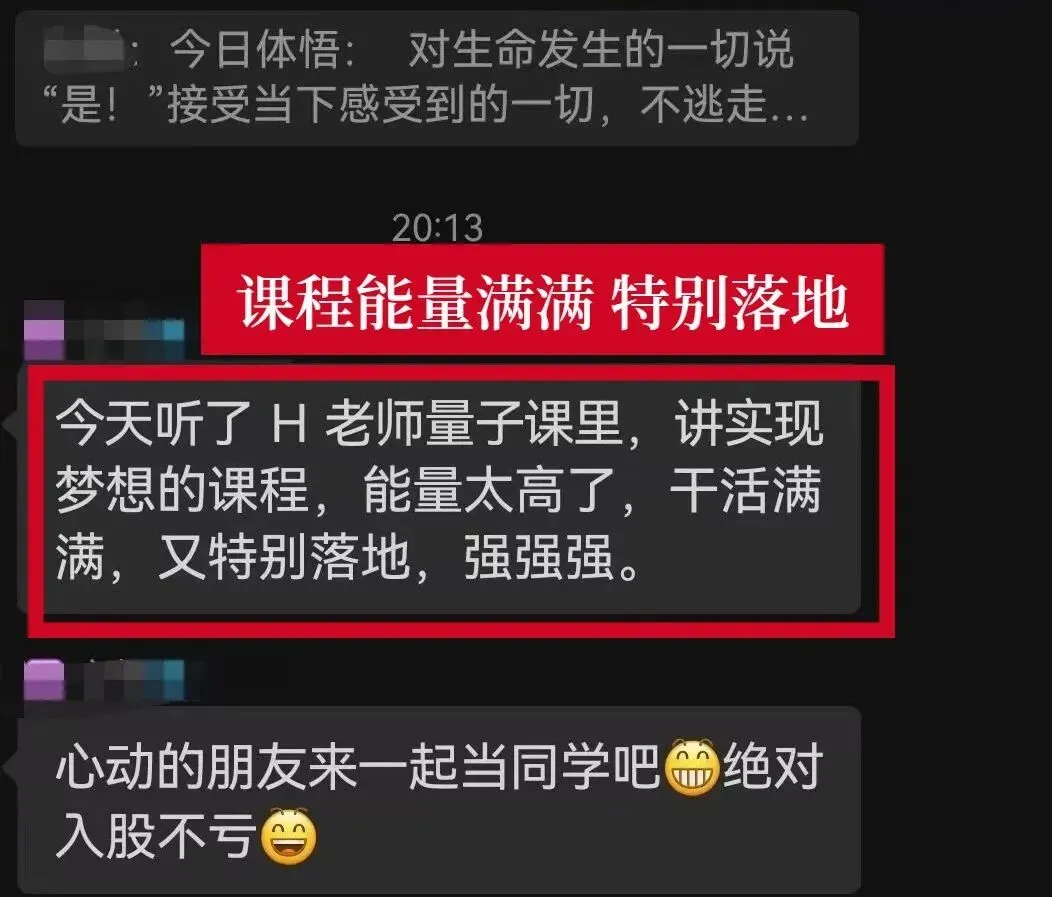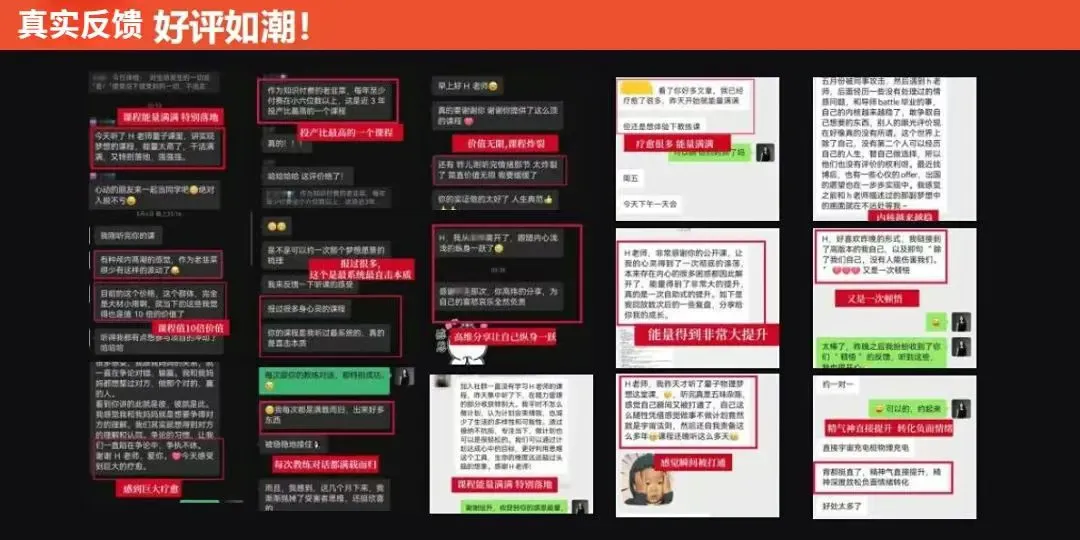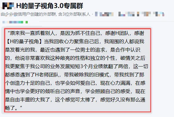 “原来我一直抓着别人,是因为抓不住自己,感谢H团队,感谢【H的量子视角】当我回收心力聚焦自己后,我周围的人都说我是发着光的我,最近也遇到了一位男士的追求,是合作中认识的,他说非常喜欢我这种敞亮的性格和独立的个性,破情关之后我更聚焦于我公司的业务发展短短3个月业绩就翻了两倍,这一切都感恩遇到了H老师团队,带我破除我的旧模式,带我找到了那个创造力十足的自己,也学会如何爱自己,现在心力满满,在感情中也学会更好的倾听自己的声音,学会照顾自己的感受,现在是自由丰盛的大我了,这个感觉可太棒了,感觉好久没有那么通畅了。”