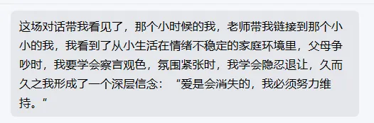 这场对话带我看见了,那个小时候的我,老师带我链接到那个小小的我,我看到了从小生活在情绪不稳定的家庭环境里,父母争吵时,我要学会察言观色,氛围紧张时,我学会隐忍退让,久而久之我形成了一个深层信念:“爱是会消失的,我必须努力维持。”
