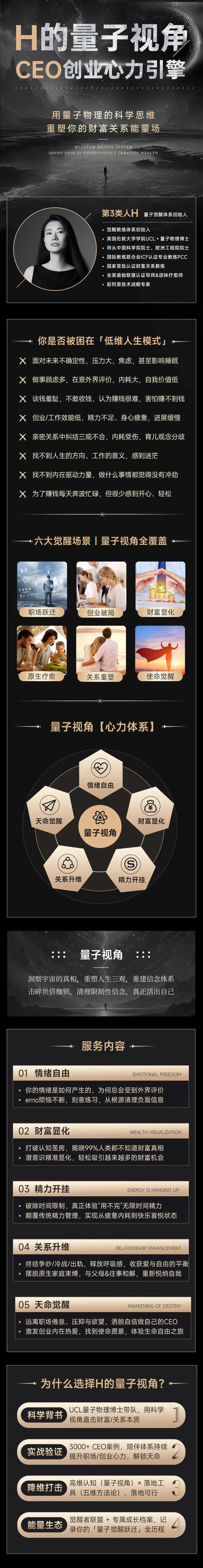 你好,我是H,一名量子身心觉醒教练,已帮助上千名创业者/职场高管摆脱迷茫和焦虑,解决财富卡点、情绪困扰、亲密关系、精力不足、创业心力不足等问题。