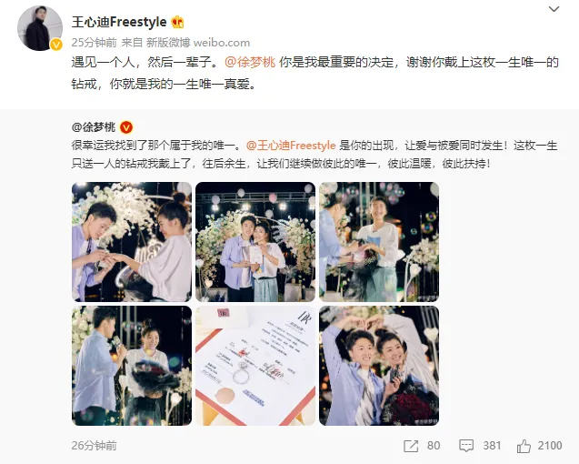 4月21日的凌晨4点21分,王心迪发文,在微博上晒出求婚徐梦桃的照片,配文:桃墩墩,你可以嫁给我吗?随后徐梦桃回应:必须的! 在徐梦桃和王心迪官宣之后,网友纷纷留言为两人送上祝福。