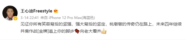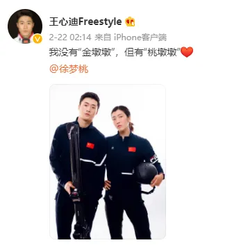 翻开王心迪的微博,会发现“含桃量极高”。开通微博七年,第一条点赞内容便是徐梦桃。此后的发文,除了训练和比赛,艾特和点赞的只有徐梦桃一个女生。