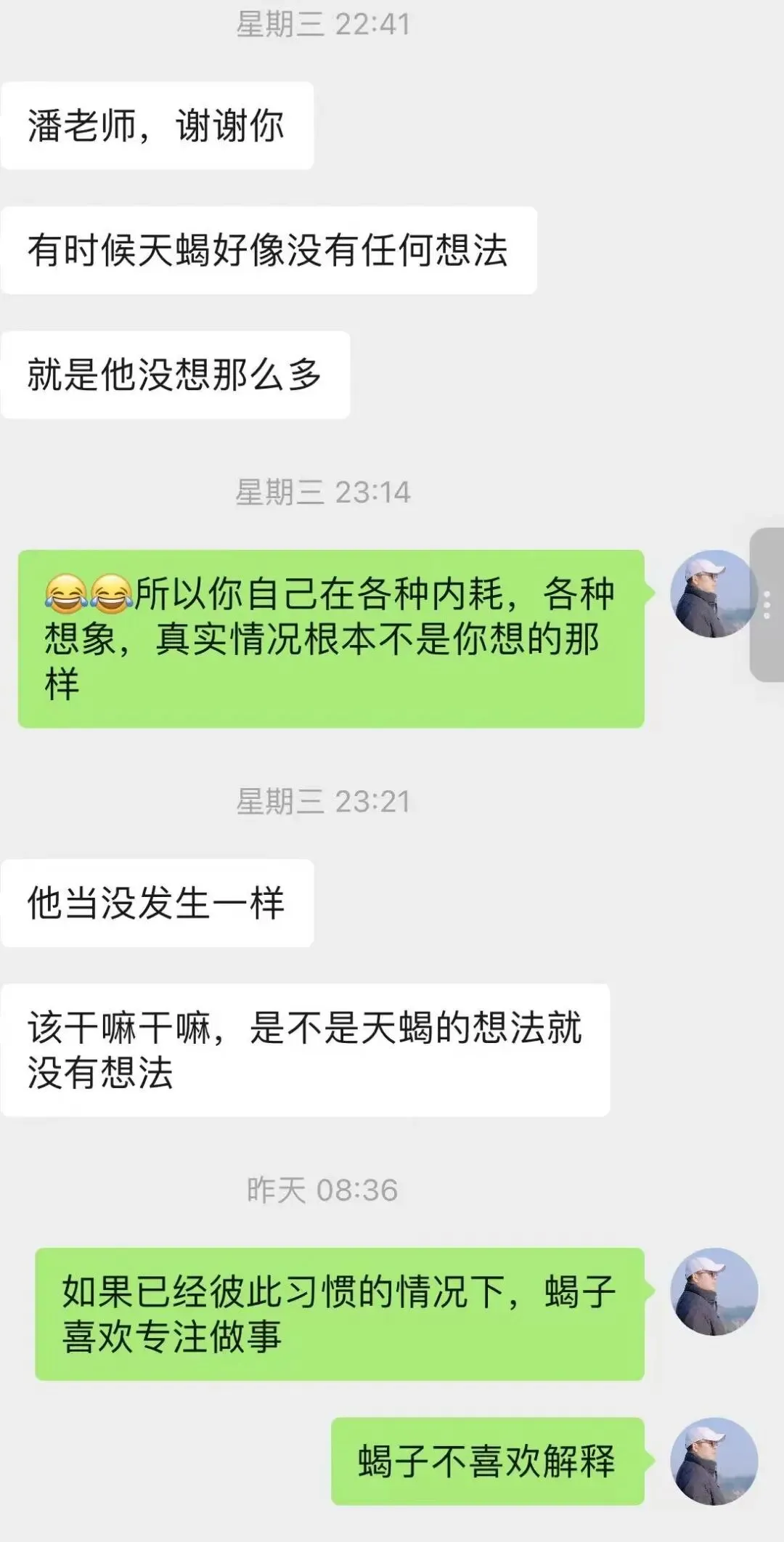 最近的一个粉丝,总是会因为天蝎座不回信息而感到困扰。所以我今天专门来写一篇文章来回应这位粉丝的疑惑吧,从天蝎座的视角来看看,和他们恋爱的三个阶段。基本上是刚和蝎子认识不久,蝎子明显地对你有意思的时期。这个时候的天蝎座好奇心很旺盛,想了解你的一切,但肯定不会直接问你,而是各种旁敲侧击。比如:从你的朋友圈去了解你的兴趣爱好,和你聊天的过程中,假装不经意地问一些信息,熟了之后,从你的朋友了解你这个人。整个过程蝎子不会做得太刻意,但是你肯定能感受到蝎子是在关注你的。这个时期,蝎子和你的互动是最多的,基本上列表里就你一个人的信息,随时等着你的信息,如果你也比较积极,并且和蝎子的话题很多,无话不谈,那这段期间,只要有空,蝎子都会很主动地给你发信息、分享日常、开启新话题。这个时期的秘诀就是保留神秘感!不要一下子全盘托出你的底牌,要懂得一点一点地让蝎子去探索,不然太快被蝎子了解的话,一下子就失去新鲜感,那就在这个阶段OVER了。经过一段时间的了解后,蝎子会暗示你表白。怎么个暗示法,就是日常聊天的时候,对你的称呼已经是”老公“或”老婆“了,又或者说一些关于未来的话题,其实也就是要告诉你,蝎子的未来里有你。如果你懂了蝎子的暗示,确定了关系,那么就进入了下一个阶段——确定期。这个时期捅破了窗户纸,你们之间的互动更频繁,也更亲密,这段时期也是和蝎子恋爱最美好的时期。蝎子会主动地送你礼物,会粘着你,会各种秀恩爱,恨不得全世界都知道你是他的人。这个时期的诀窍就是观察蝎子怎么对你,你也以同样的方式去回应蝎子。同时这个阶段的蝎子可能会开始作,作的原因以前的文章讲过,就是你没有GET到蝎子的点。确定期过后的时间,彼此都很了解了,彼此都已经习惯了对方的行为方式,这时候蝎子就开始冷却了。(其实任何一段恋爱,甜蜜期过后都会出现)该做的事情蝎子会做好,但是互动之类的会明显减少,因为蝎子会专注于自己的事情。比如蝎子在出差中,想安心看一部电影,正看得起劲的时候,你打视频过去,蝎子不会像往常一样立刻就接,他会优先把电影看完,然后再回你视频,因为他如果中途接了视频,节奏就会被打乱。对蝎子来说,更希望能先处理好自己的事情,但对对方来说,突然就感觉蝎子变了。这个时期的诀窍就是学会和蝎子一样,专注于自己的事情,最好是能有个自己的新爱好,因为蝎子是不会满足于当下的状态的,是会不断进步的,而且,如果你能向蝎子展示你的新爱好,对于蝎子来说,也是一种新鲜感:哇!TA居然会这个?这样也能让蝎子眼前一亮。任何一段感情都有刚认识的新鲜劲、确定关系后的甜蜜时刻、以及甜蜜过后的消退期,这都是很正常的事,关键是如何不断地去提升自己,充实自己,而不是总是纠结于对方爱不爱我,对方到底怎么了之类的事情,这样只会不断内耗,最终失去自我。当你失去了自我,也就失去了对对方的吸引力。我是老潘,做婚姻家庭辅导员看过了太多因为激情退却而纠结的夫妻,如果,你也有这样的困惑,欢迎找我聊聊。