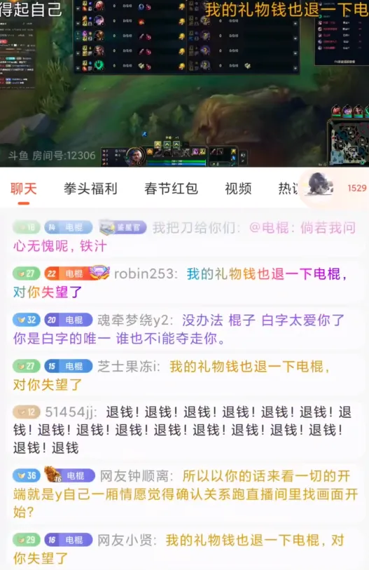 据严姐所言,当时两人处于恋爱关系。有次她发现电棍在直播间搂着其他女生,刚睡醒的她情绪比较激动,发弹幕让他看微信。后来才知道那是果盘环节。这条弹幕被无限放大,两人的恋情也因此意外曝光。
