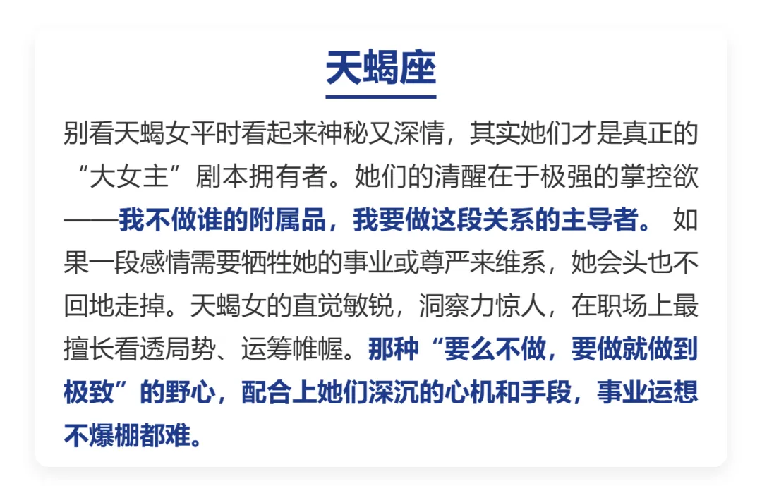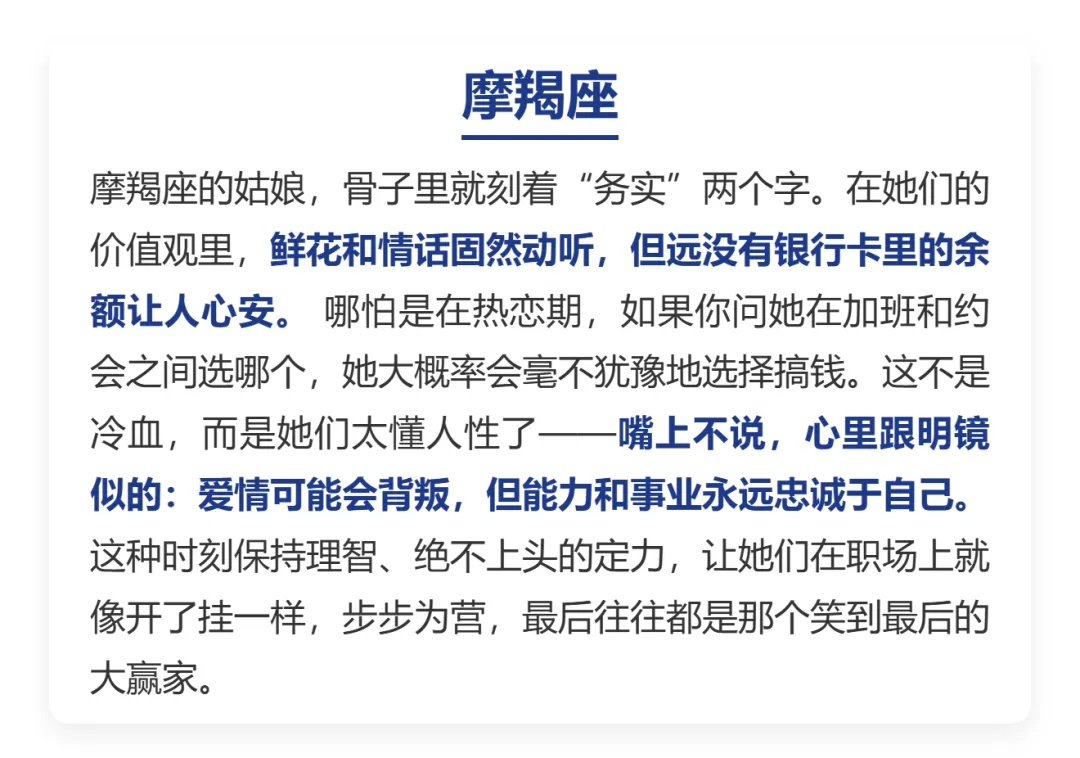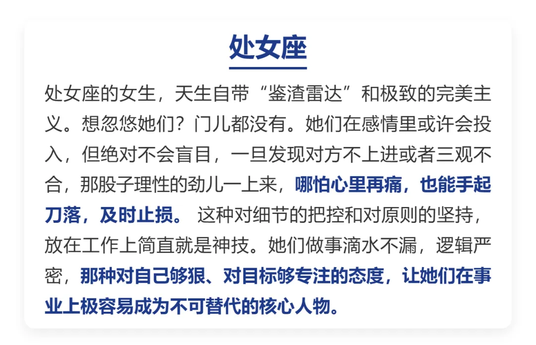 在这个谈.恋爱.就像开盲.盒的年代,很多姑.娘一.碰感情.就容易.迷失自己,恨不得把.心都掏.给对.方。但说实.话,真正活.得漂亮.的女人,往往都.带着点.儿“狠劲.儿”。她们不.是不.需要爱情,而是太.清楚.自己要.什么了——比起依.附于谁,她们.更愿意做.自己.的靠.山。 今天咱们.就来.盘点一下,哪三个.星座的姑.娘最是.人间清醒,事业运想.不旺.都难。