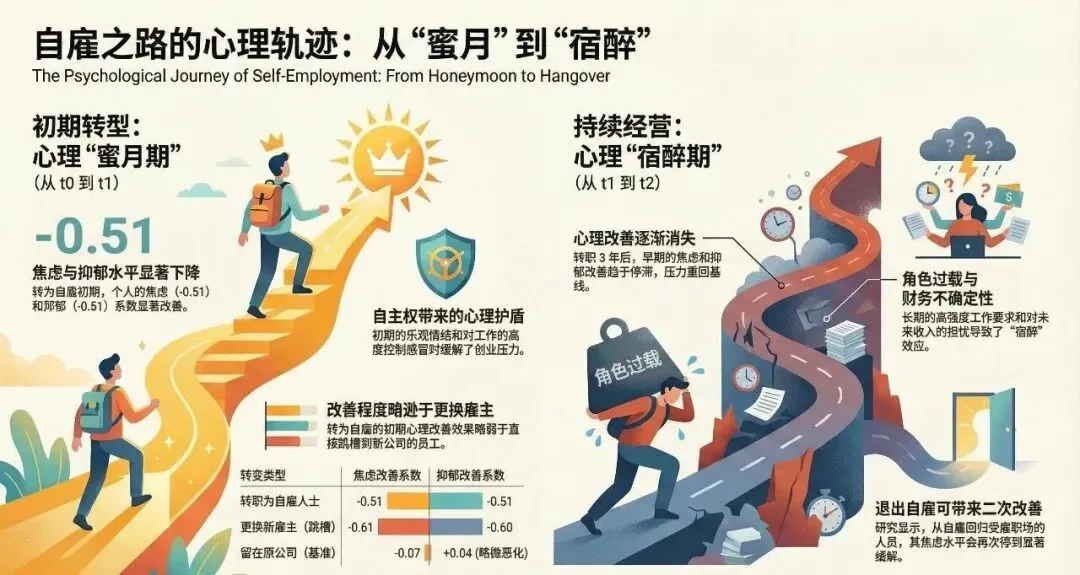 研究数据表明,在转型后的第1到2年,创业者的焦虑和抑郁水平会出现显著下降。这背后的原因其实很好理解: