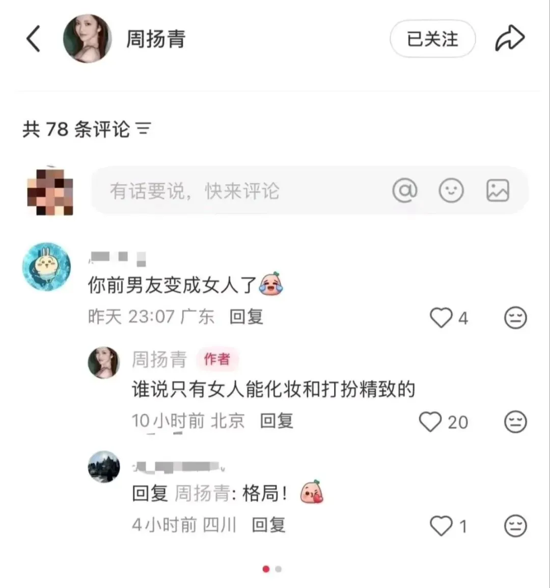 好利来大公子周扬青分手原因,原来如此难怪之前上节目包袱那么重,被画花脸那么生气,网友告诉周扬青你前男友变成女人了,周扬青大方回复谁说只有女人能化妆和打扮精致的,太震惊我了。