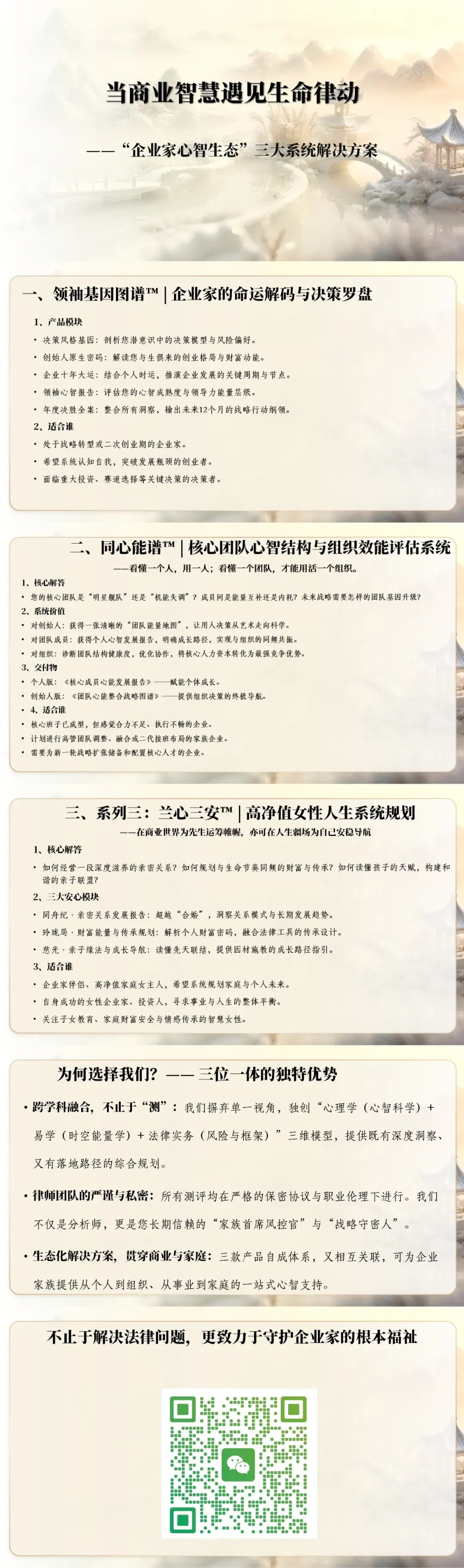 缩短“信任恋爱期”,绝非依靠销售话术或廉价承诺,而是通过一套精心设计的系统,持续、稳定地向市场输出“专业价值”、“过程确定感”与“情感安全感”。它要求律所和律师,将自身重新定义为“信任工程师”:将专业能力“产品化”输出,降低客户的认知与尝试成本。将服务过程“透明化”呈现,提升客户的可控感与安心度。将沟通重心“共情化”校准,直达客户的情感与价值需求。当这套信任工程运转流畅,律师与客户的相遇,便不再是充满疑虑的试探,而更像是久别重逢的携手。信任,这个法律服务世界最昂贵的货币,其流通效率将被极大提升。而这,正是所有卓越律所在这场“心智争夺战”中,所能构建的最深的护城河。至此,我们从行业模式的反思,谈到技术冲击下的转型,再到市场扩张的战略、商业模式的辨伪,最终回归到“人”的产品本质与“信任”的构建心法。这一系列思考,始于对“八仙过海”现实的成功解读,终于对“筑巢引凤”未来的系统构想。然而,所有这些理性的探讨,在笔者一次回乡的偶然际遇中,却与一个千年的文化意象产生了奇妙的共鸣。这最后的篇章,就让我们从商业与管理的世界暂时抽离,聆听一个来自故乡的隐喻。邱旭瑜律师·心学导师