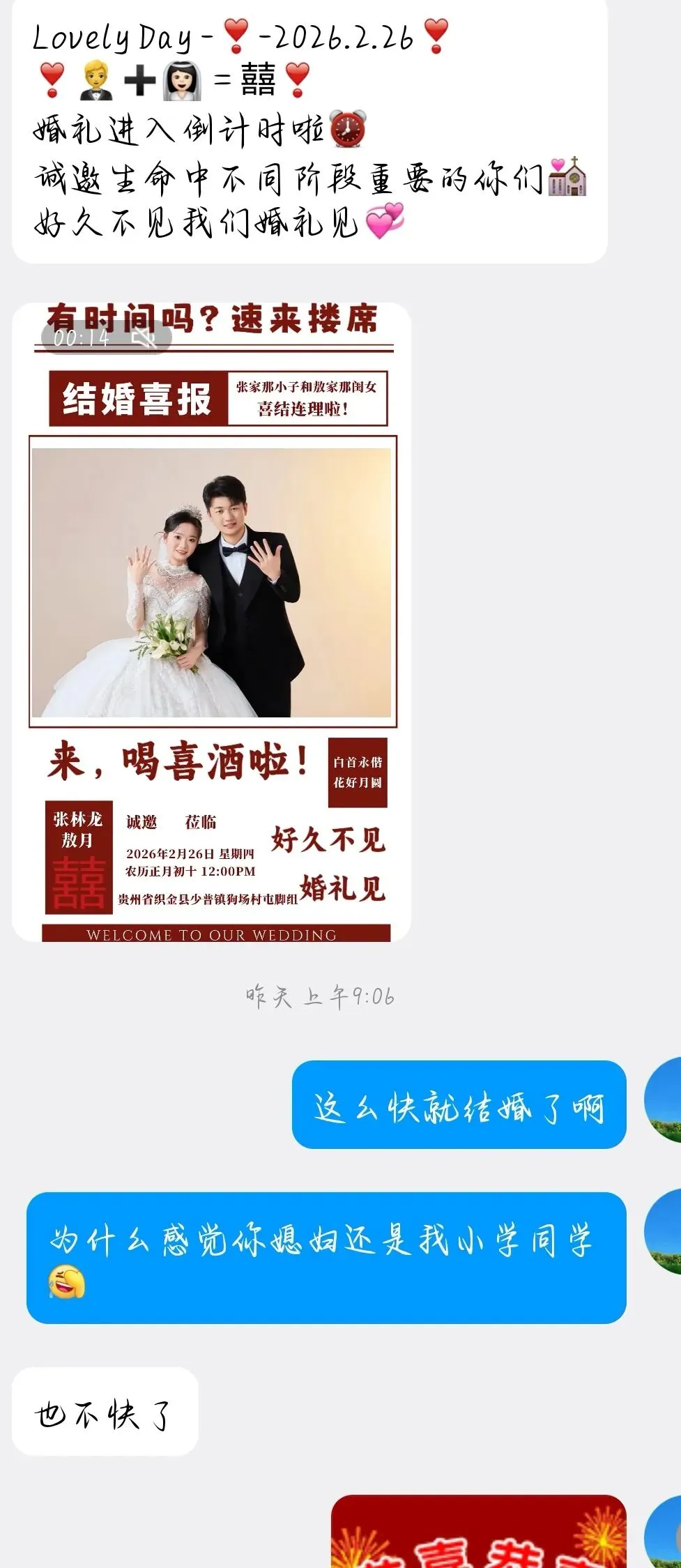 意外看见他发来的结婚邀请函,我点开一看,怎么她现在要娶到媳妇怎么像我小学同学。