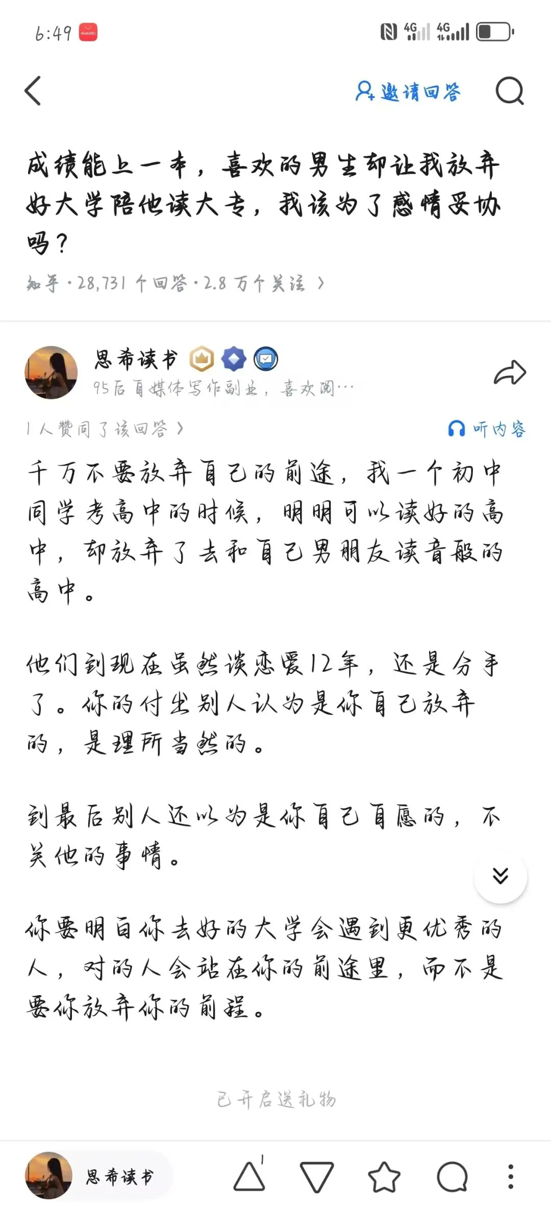 问:成绩能上一本,喜欢的男生却让我放弃好大学陪他上大专,我该为了感情妥协吗?