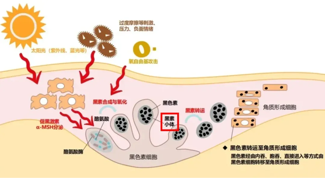 当紫外线穿透表皮后,会刺激黑色素细胞中的酪氨酸酶活性,加速酪氨酸→多巴→黑色素的链式反应。