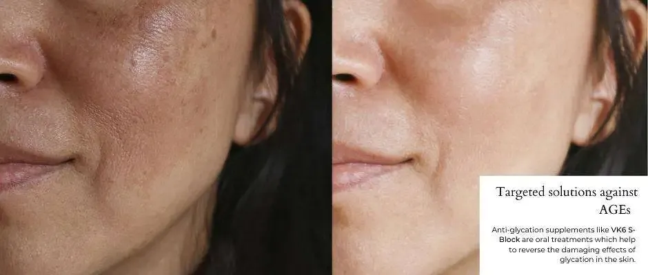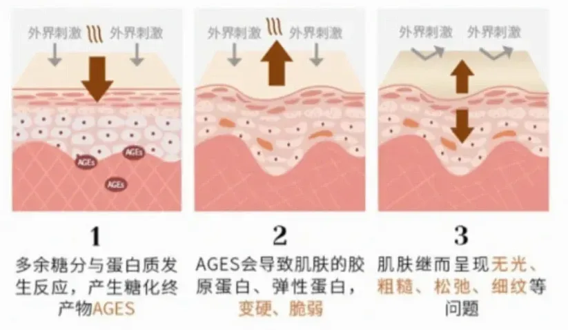 健康的胶原是乳白色的,但随着年龄增长或摄入过多糖分,胶原蛋白会发生非酶糖化反应,生成褐色的晚期糖基化终末产物(AGEs)。 就如同食物烹饪过程中会发生糖化反应,颜色变深、质地变硬一样,皮肤内的糖化反应也会导致皮肤暗黄、失去弹性。