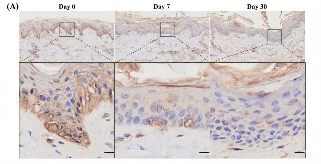 Western blot结果表明,在激光处理后酪氨酸酶Tyrosinase蛋白表达在第7天明显下调,并且这种抑制状态一直持续到第 30 天。