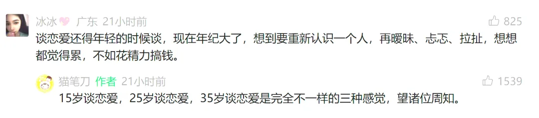 昨天看猫笔刀的公众号,后面有人留言了不同年龄段的恋爱感受都不一样,认同者众:
