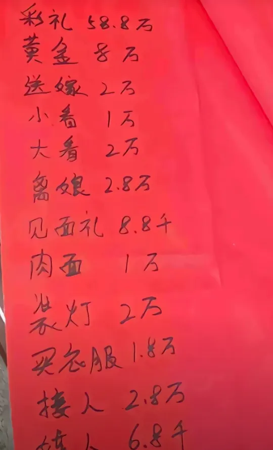 天价彩礼 + 金价大涨,婚姻成了 “金钱交易”。在老家的华北乡村,彩礼早已不是过去的 “心意钱”,而是成了攀比的筹码。十年前,彩礼还是三万八、五万八,如今已经涨到了十六万八、十八万八,甚至有的村子涨到了二十万八,美其名曰 “万里挑一”“万紫千红一片绿”。而今年金价的一路飙升,更是让结婚五金的成本翻了一番,从以前的三万五万,直接迈入了十万大关,金手镯、金项链、金戒指、金耳环、金吊坠,少一样都不行,成了结婚的硬性门槛。再加上 “一动不动” 的要求 —— 农村有房、县城有楼,一辆代步车,结个婚的成本,动辄五六十万,甚至上百万,这对普通的农村家庭来说,无疑是天文数字。为了结婚,父母的养老钱、爷爷奶奶的棺材本,四个钱包被掏空,甚至要借网贷、民间贷,婚后一家人背着沉重的债务过日子,这样的婚姻,从一开始就充满了苦涩。