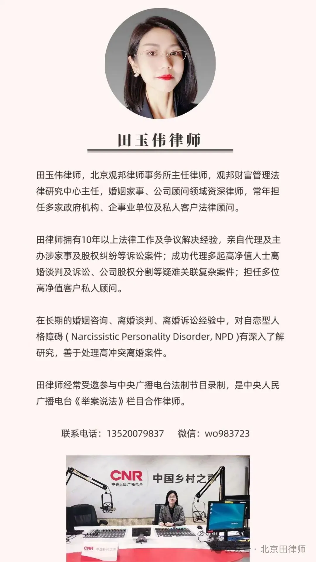 我是北京田律师,也是心理健康师,处理过大量NPD离婚纠纷,为受害者提供离婚陪跑、谈判,代理离婚诉讼,帮助您逃离有毒婚姻。